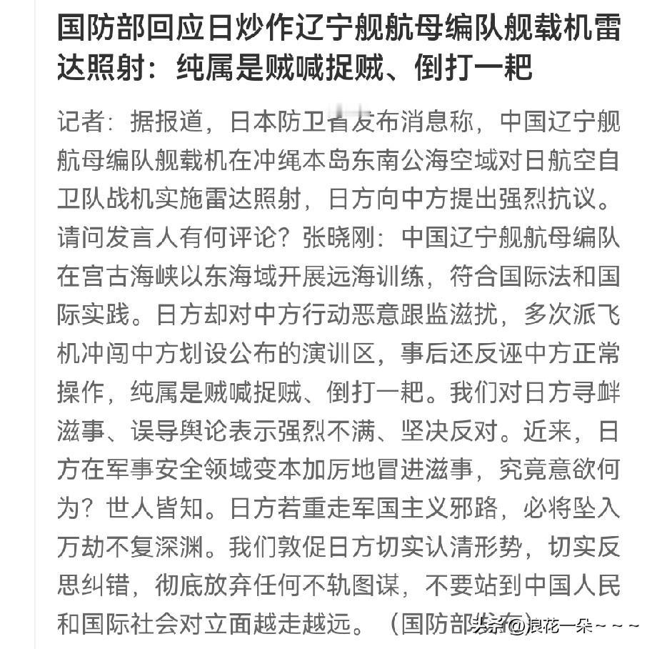 强!国防部回应: “纯属是贼喊捉贼,倒打一耙”…(图二)[赞]在我看来,“新日本鬼子”太贼了,我们是正常的演习训练,他们却私自冲重闯我们的训练区,我们的战斗机把他们当靶子用雷达照了几下,他们就开始受不了了,开始叫冤,哭爹喊娘的!其目的昭然若揭,就是用假消息骗得国际社会理解和支持,企图转移日本民众对国内矛盾的注意力,取得更多日本民众的理解。 此前,日本的小泉进次郎发帖炒作辽宁舰航母编队舰载机雷达照射日本F-15战斗机!