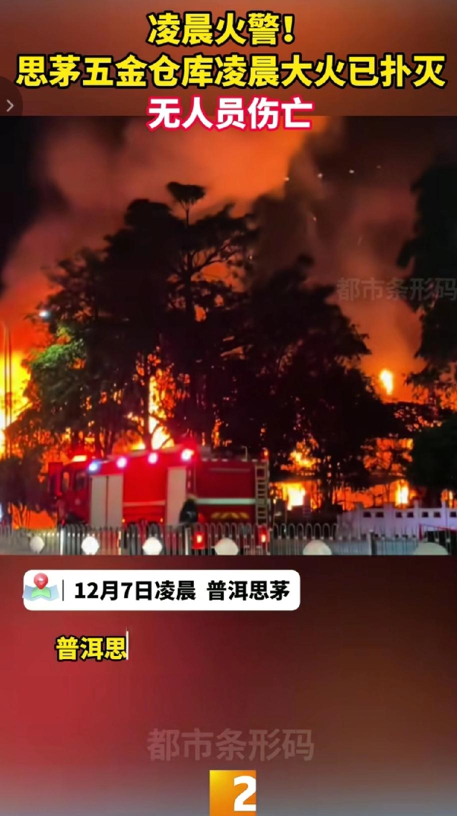 2025年12月7日凌晨,普洱思茅区一五金仓库发生火灾。经消防等多部门联合扑救,明火于5时25分许基本扑灭,无人员伤亡。目前起火原因及财产损失正在进一步调查中,信息来源为思茅区应急管理局。(来源于@都市条形码)
