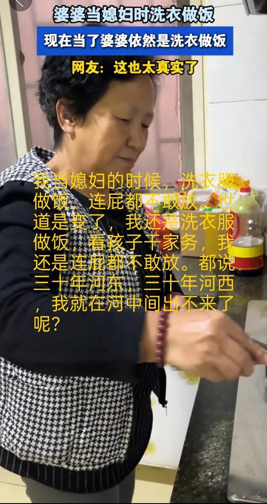 三十年河东婆当家,三十年河西媳当家, 就是可怜了中间这一波人被揪着不放! 女子问妈,“你当过媳妇,也当过婆婆,有什么感悟?” 妈的回答太真实了,“我当媳妇的时候,洗衣服做饭,连屁都不敢放。世道是变了,我还是洗衣服做饭,看孩子干家务,我还是连屁都不敢放。都说三十年河东,三十年河西,我就在河中间出不来了呢?” 一代人有一代人的坑,赶上时代了,80后的坑,巨大!始终就上不了岸。 有人说一个愿打一个愿挨,心甘情愿,能怪谁?那是,因为婆婆淋过雨,只想给媳妇撑一把伞! 婆贤媳善,家庭美满!