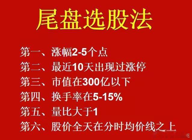 今天买,明天卖!只看尾盘30分钟,短短18个月,就从7位数,做到了一个小目标!这就是尾盘选股法,你可能不知道这套方法,但是您一定听说他创始人的名字!就是短线快刀客杨永兴,仅仅28岁就实现财富自由,将资产做到了9位数!家人们好,我是洪帮主,一个还在不断成长,新生代的职业选手一枚!大部分人都知道,做股票今天买,明天才能卖!也称作t+1交易机制,在这期间我们要承受市场波动,面对下跌风险却无能为力。但是有人却通过这个方法,直接将股票玩成了T+0,根本不用担心市场会下跌,如果对了,就继续持有,让利润迅速奔跑!如果错了,立马就止损,加上手续费,顶多亏1-2点的!如果您的账户在7位数以上,想通过股市挣到一些私房钱的话,那今天这方法一定要把他学会了,总共只有八个步骤!那这套方法我印象非常深刻,在去年的10.8号,当天大盘直接高开300来个点,不管是新股民还是老股民,都认为牛市来了,一股脑往里冲!结果当天高开低走,直接砸了200来个点,有很多人就是在这里高位站岗,甚至有的人到了今年还没有解套!但是,我资管团队的一个操盘手却不一样,在10月大跌行情中,它不仅没有亏,利用这套尾盘选股法,反而还拿到了68个点月度盈利!他大学毕业才3年时间,交易体系当中,80%以上的操作,都是来自于尾盘30分钟,我翻看了他最近2年的操盘记录,发现有一个特点,他虽然是做短线,出手频次也是比较高,但是全年12个月,基本上账户回撤幅度没有超过10个点,盈亏比可以说甩开大部分老牌职业选手。一共只有6大要点,家人们认真,做好笔记!第一步,尾盘30分钟开始选股,打开A股涨幅榜,选择涨幅在2-5个点票,加入自选。第二步、选择最近10个交易日,出现过涨停的品种,有涨停,才能说明最近有资金关注。第三、看市值!300亿以上直接删除,太大了,没机会,根本拉不动。第四,看换手!只选择5%-15%这个区间的,太低了不活跃,换手太高,可能主力正在出货。第五、再看量比排序!量比小于1的,直接删除!没量的股票就是浪费时间。第六步,看分时走势,截止到下午两点半,如果股价全天都在分时均线上方运作,那就说明当天进场的筹码,基本上都是挣钱的,后期是走势会非常稳。那最后,为了避免大家记不住,我把这6点,总结成了一张图片,大家可以收藏保存起来!也可以转发给身边正在炒股的好朋友,那今天分享就到这里,我是帮主,一个喜欢交易,热爱分享的实战派,我们下期视频再会!