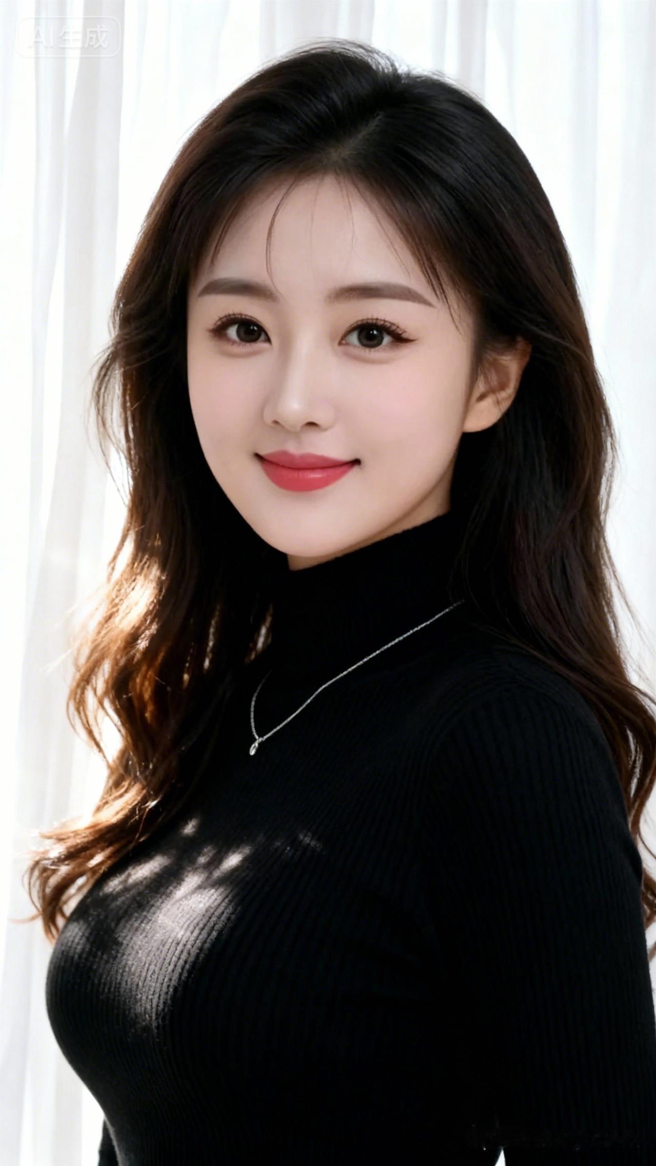 她气质温婉优雅。深棕微卷长发蓬松,黑色高领毛衣配白金项链,姿态端庄。