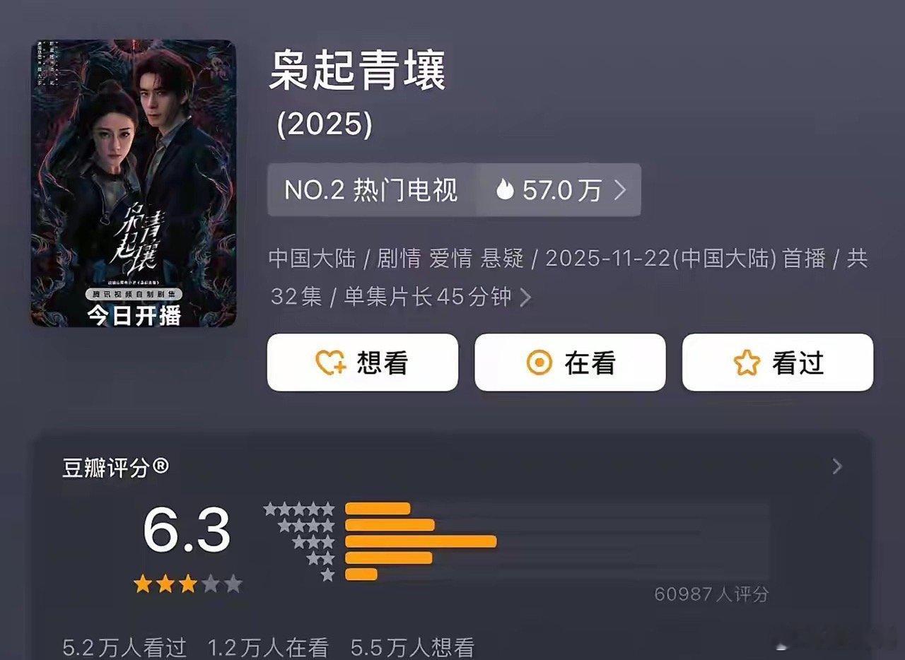 迪丽热巴《枭起青壤》正式播完了,从各个维度,来看看这部剧的播出成绩单,纯数据微博。1、豆瓣评分:6.3分,打分人数6w,3⭐占比最多。2、站内最高热度27289。3、云合单日最高热度排名第二,单日最高热度2250w,截止目前集均1000w左右。4、广告方面:开局6广告,萝卜🥕两集。客观说,这种成绩如何?