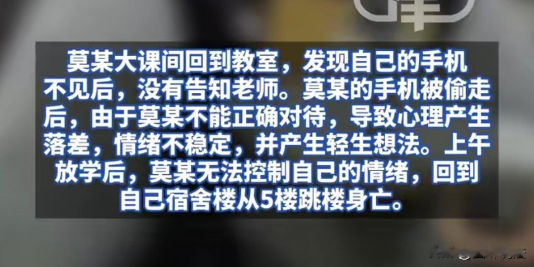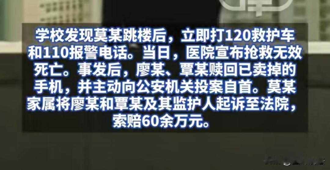 广西来宾,初三男生的手机被两名同学偷走卖掉,但男生是偷偷把手机带进学校的,他不敢告诉老师,可手机就像他的命一样,手机丢了他情绪不稳定,有了轻生的念头,上午放学后,回到宿舍就从5楼跳下身亡。男生家属将2名同学及其监护人起诉至法院, 索赔60余万元,而法院判赔18万。 莫同学是一名初三学生,他平时非常爱玩手机,在学校禁止带手机入校的情况,他还是偷偷把手机带进学校。 2025年3月27日上午,学校组织学生进行大课间活动,期间廖某、覃某等四位同学违纪逗留在教室。 后来,廖某、覃某无意间发现莫同学放在课桌里面的手机,俩人一合计,有了坏心思。 他们知道即使莫同学的手机不见了,他肯定也不敢告诉老师,所以廖某、覃某毫无顾忌的把手机偷走。 大课间结束后,莫同学回到教室,发现自己的手机不见了,果然不敢告诉老师,当时他的心情坏透了,甚至有了轻生的念头。 而廖某、覃某在莫同学不敢告诉老师的情况下胆子大了起来,第三节课向老师请假出校,把手机买了,买得的200元一人100,事后去奶茶店喝奶茶。 廖某、覃某卖了手机有钱去享受了,可莫同学却备受煎熬,他情绪越来越不稳定,想到心爱的手机不见了,告诉父母肯定被骂,父母也不可能会重新给他买一个,他受不了了,上午放学回到宿舍,从5楼一跃而下。 学校发现莫同学跳楼后,立即打120救护车和110报警电话。可惜的是,莫同学没能抢救回来,永远离开了这个世界。 得知莫同学跳楼身亡,廖某、覃某猜测应该是和手机丢失有关,一条人命啊,他们害怕极了,赶紧赎回已卖掉的手机,并主动向公安机关投案自首。 2025年3月28日,公安局分别对廖某、覃某处以行政拘留十日的处罚,追缴被盗手机一部。 《治安管理处罚法》第二十三条规定: 违反治安管理行为人有下列情形之一,依照本法应当给予行政拘留处罚的,不执行行政拘留处罚: (一)已满十四周岁不满十六周岁的; (二)已满十六周岁不满十八周岁,初次违反治安管理的; (三)七十周岁以上的; (四)怀孕或者哺乳自己不满一周岁婴儿的。 但因廖某、覃某俩人都未满十六周岁,并且是初次违反治安管理条例,所以不执行行政拘留处罚。 而事发后,学校深知莫同学的死亡学校有一定的责任,于是与莫同学家属达成赔偿协议,向莫同学家属赔偿了15万元。 而莫同学的家属知道,莫同学之所以会跳楼,罪魁祸首是廖某、覃某俩人,于是把他俩以及其监护人告上法庭,索赔各项损失60万。 莫同学是在手机被偷之后情绪不稳定,这才有了轻生的行为,他的死亡和廖某、覃某存在着因果关系,他们肯定是要承担相应责任的。 而莫同学虽然是未成年,但在他这个年纪,对待任何事应该有一定的理性和承受力,深知跳楼产生的后果,但他却选择了轻生,其也有一定的责任。 当然,学校肯定也是有责任的,学校对学生未尽到教育和监管的责任,对莫同学跳楼身亡也存在一定的过错,原本也应承担相应的责任。 但是在事故发生后学校积极和莫同学家属协商,与莫同学家属达成赔偿协议,学校已按协议赔偿了原告部分损失,故学校不需再承担赔偿责任。 最终,经法院认定,原告各项损失合计875144元。由廖某、覃某承担20%赔偿责任即175028.80元。 虽然莫同学的离去对其家属打击非常的大,但他的家属主张精神抚慰金10万元过高,法院酌情认定精神抚慰金1万元。 《民法典》第一千一百八十三条:侵害自然人人身权益造成严重精神损害的,被侵权人有权请求精神损害赔偿;故意或重大过失侵害具有人身意义的特定物造成严重精神损害的,同样适用。 亲属的离世,一般来说肯定是难以接受的,精神上会有一定的损害,莫同学家属要求精抚慰金合情合理。 但精神抚慰金不是说要求多少就多少的,是有一定标准的。 最终,法院判决廖某、覃某及其监护人连带赔偿莫同学家属各项经济损失185028.80元。 莫同学之所以会做出跳楼行为,是因为他对手机的执着,作为父母,应该关注孩子的行为,引导孩子树立正确的价值观、人生观,嚷孩子健康快乐的成长。