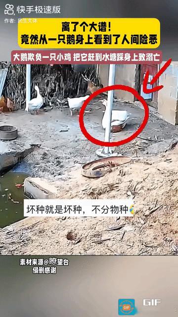 “太恐怖了!”大鹅欺负一只小鸡,不停的用嘴巴啄它,还用嘴巴咬住小鸡一路把它推进水塘里,就这还不放过小鸡。为了防止小鸡上岸,大鹅也跟着下水了,不停的把小鸡往水里摁,还踩在小鸡身上,确保小鸡整个都溺在水里。直到小鸡彻底的不挣扎了,大鹅才放开它,甚至大鹅还确认了一下小鸡真的是溺亡了,大鹅才从水塘里起来! 网友感叹:竟然在一个大鹅身上看到了人间险恶! 看完整个过程真的是心里无法平静,看来欺负弱小在任何物种里都存在啊。这简直不可思议,这大鹅怕不是成精了吧,它好像有自己的思维,不是赶跑小鸡,而是目的很明确的就是要弄死小鸡,这鹅不能再养了不然剩下的鸡也危险了。 鹅其实胆子很大,别说小鸡那么没有攻击性的,就是人它都敢咬,小时候我就被鹅追过,每次上学经过那里,那个大鹅就要伸长脖子做出要啄人的样子追着我们跑,吓的我们宁愿绕远路,我不敢再从那里走了! 以前也没少见鹅欺负其他动物,但这样的还是第一次见,简直太不可思议了,果然坏是不分物种的! 当然也有网友猜测应该是这只鸡先伤害了大鹅,所以大鹅报复回来,当然这也不是不可能,只是这大鹅的作风太吓人了,被欺负了就欺负回去,不至于要小鸡的命,总感觉它有了思维一样! 对此你怎么看? (视频:民生文体,侵删[祈祷])