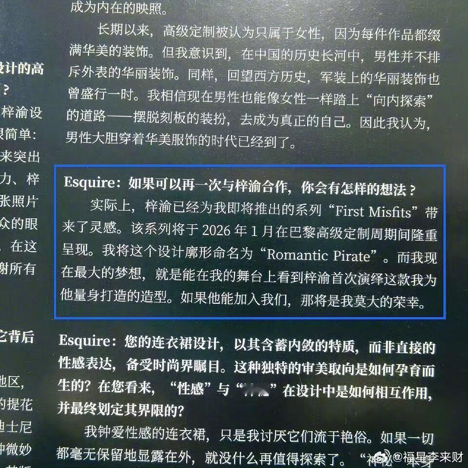 梓渝✖️2026巴黎时装周梓渝锁定2026巴黎时装周席位的消息太让人期待!强势锁定席位的他接连收获重磅邀约——不仅收到Steven Passaro的正式邮件邀请,更成为高定品牌Julien Fournié“First Misfits”系列的首选合作对象与灵感缪斯,国际时尚版图持续扩张。