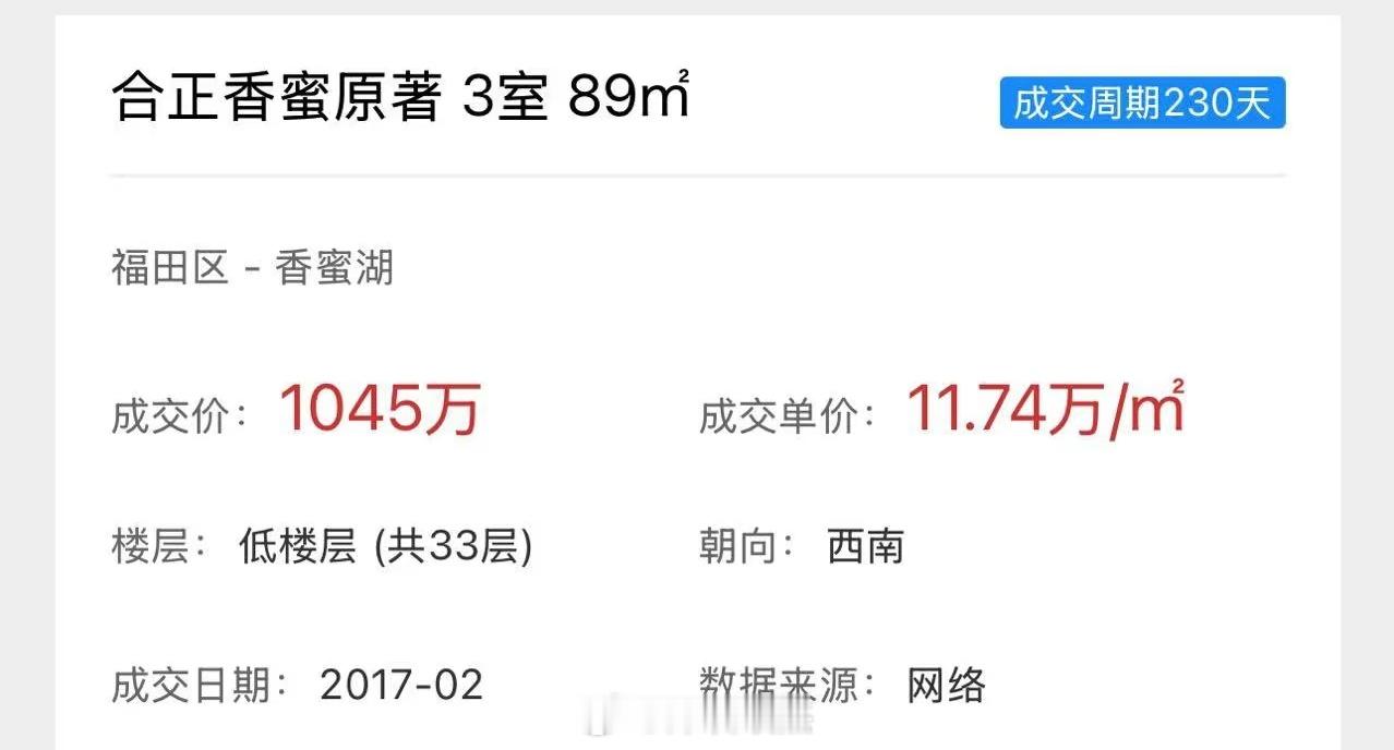 福田香蜜湖香蜜原著89平,2016年1045万买的,现在中介说999万。在这边房子算新的,楼下就是侨香外国语,这套1栋01低楼层也还好,不吵。应该很快能卖出去。深圳