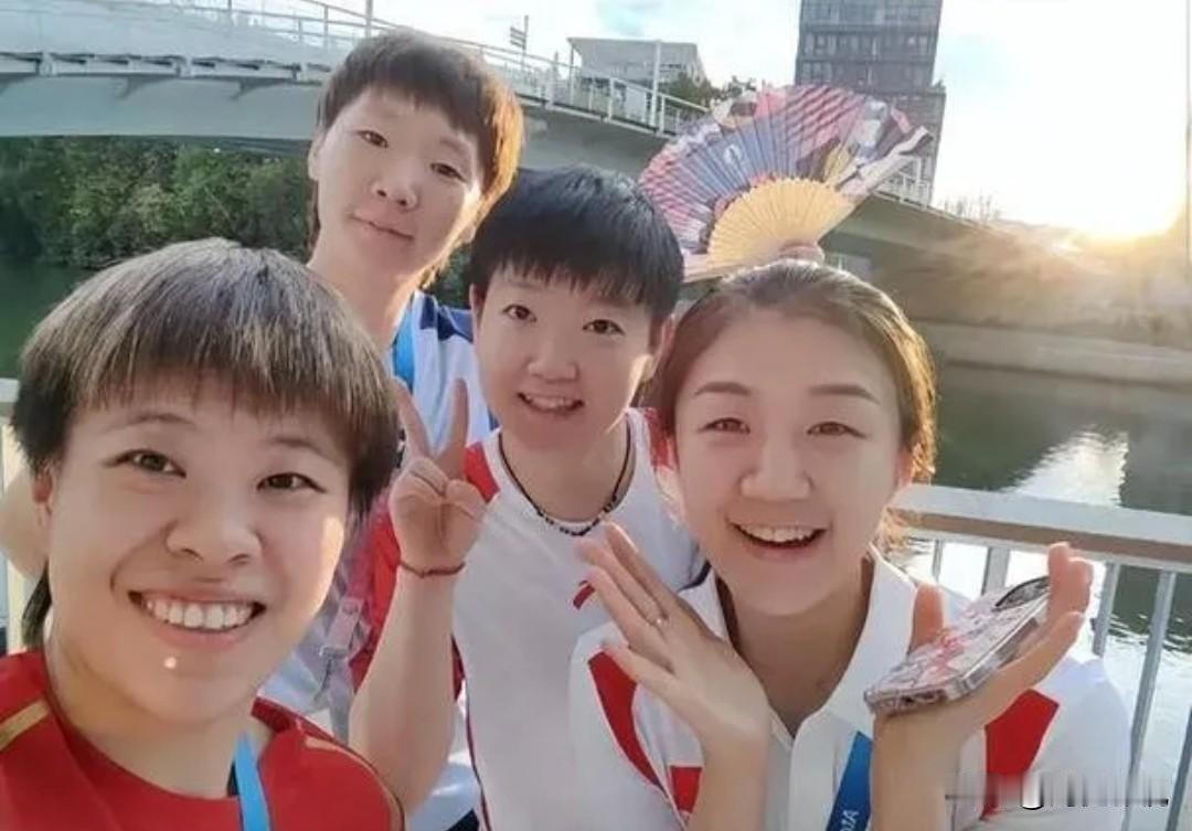 仔细看,还是眉欢眼笑的陈梦最漂亮!后面的孙颖莎始终煞是可爱 。短发利落的王曼昱,依然高挑清瘦。三位都是国乒女队里的佼佼者!很喜欢这三位,不骄不傲的屡屡夺冠,为国争光!而左边的是谁?笑意粲然,素齿如贝,能与陈梦、孙颖莎、王曼昱女乒名将合影真是不一般!难道,她也是女乒队员吗?有谁认识她?