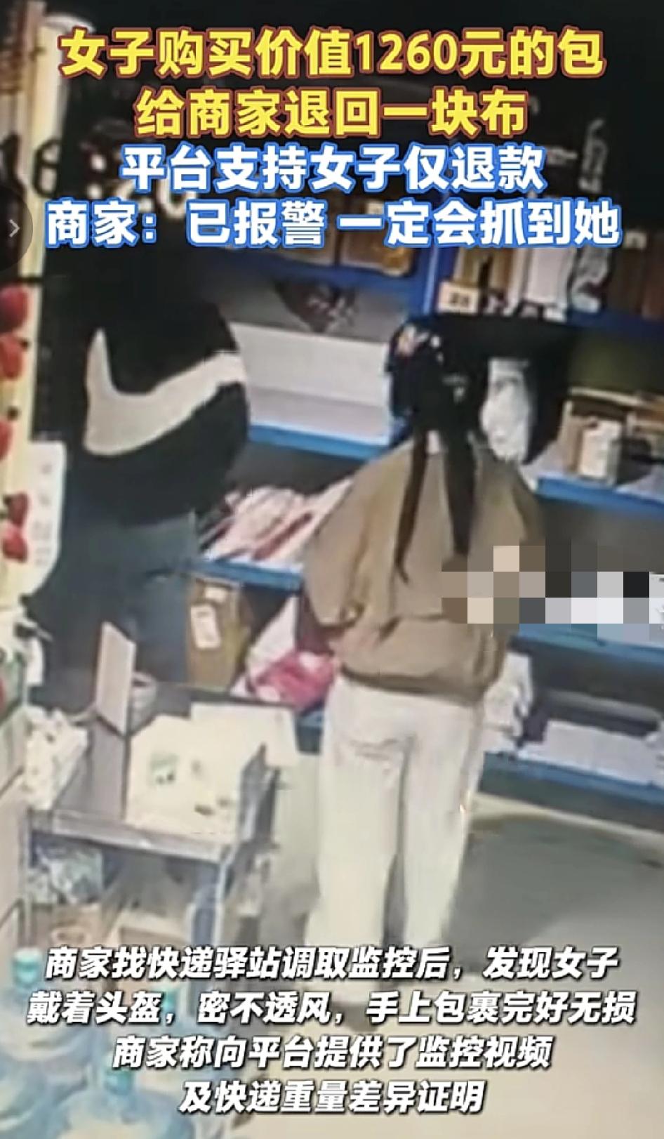 广东一女子在网上购买了价值1260元的包,竟然退回给商家一块布,而平台却给女子成功退款,商家称看到退回来一块布非常生气,于是在快递驿站调取监控,找到该女子发现其包裹得非常严实,密不透风。不过给平台已经提供了相关的监控视频和重量证据等等,商家表示必须要把女子抓出来。