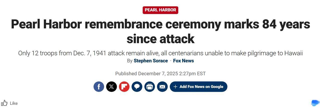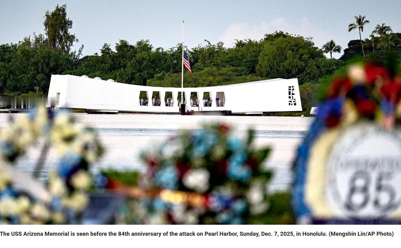 美国举行珍珠港事件纪念活动 当地时间周日上午7:55,珍珠港事件纪念活动在夏威夷举行,默哀时刻与1941年12月7日日本轰炸开始的时间相同。 今年是珍珠港袭击袭击事件84周年,这场袭击造成2300多名士兵死亡,并直接推动美国卷入二战。 活动主持人大卫·小野说:“通过这次纪念活动,我们认识到纪念过去那个和平前景破灭、国家陷入全球战争的时刻的重要性。” 如今全美仅有12名亲历珍珠港袭击事件的士兵幸存,由于年龄问题,今年都未能前往夏威夷亲自参加这一活动,这意味着现场所有人没有第一手的记忆,没有人在这场袭击中服役过。 1991年50周年活动时约有2000名幸存者参加,去年,只有两人到达现场。