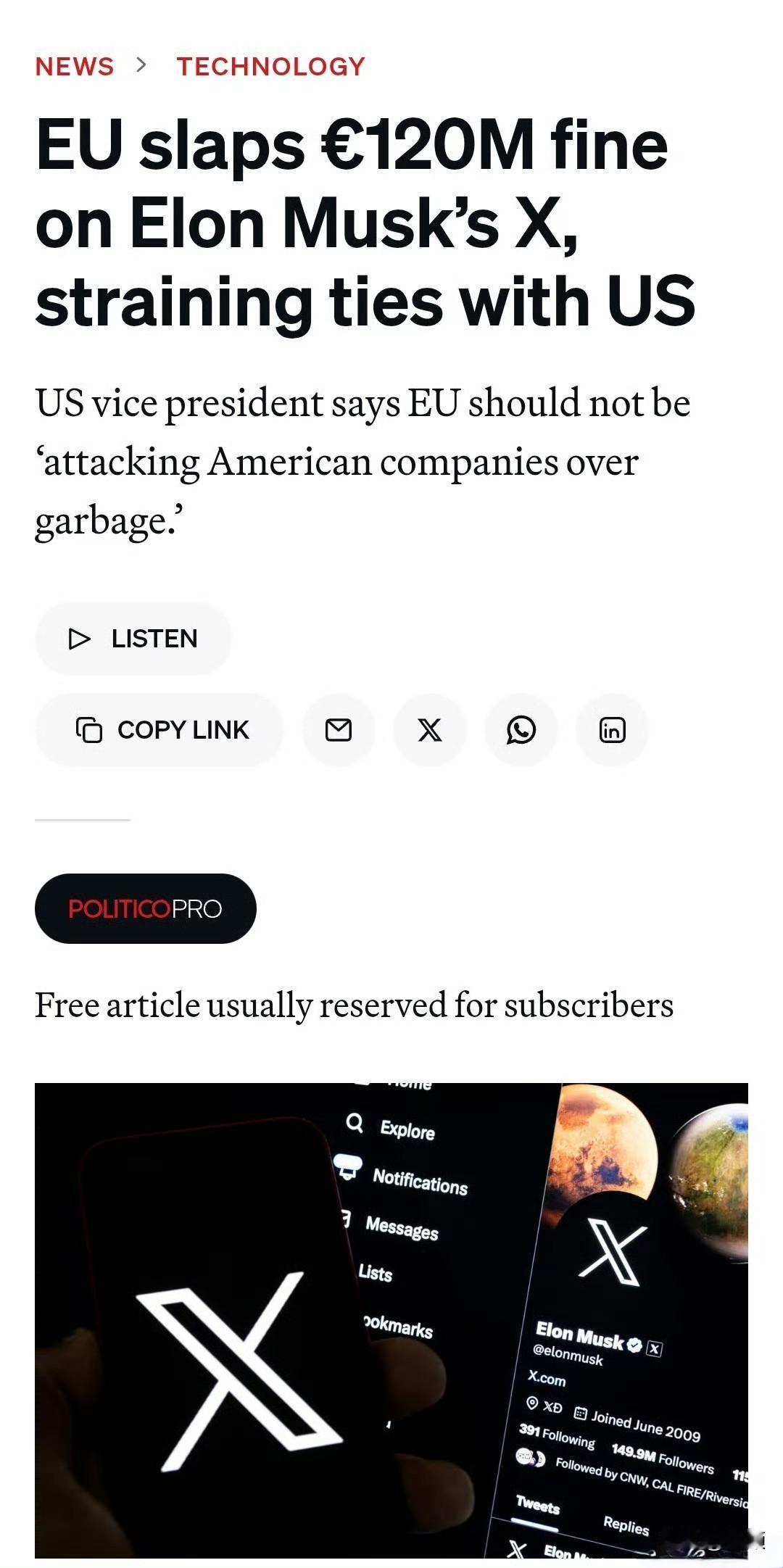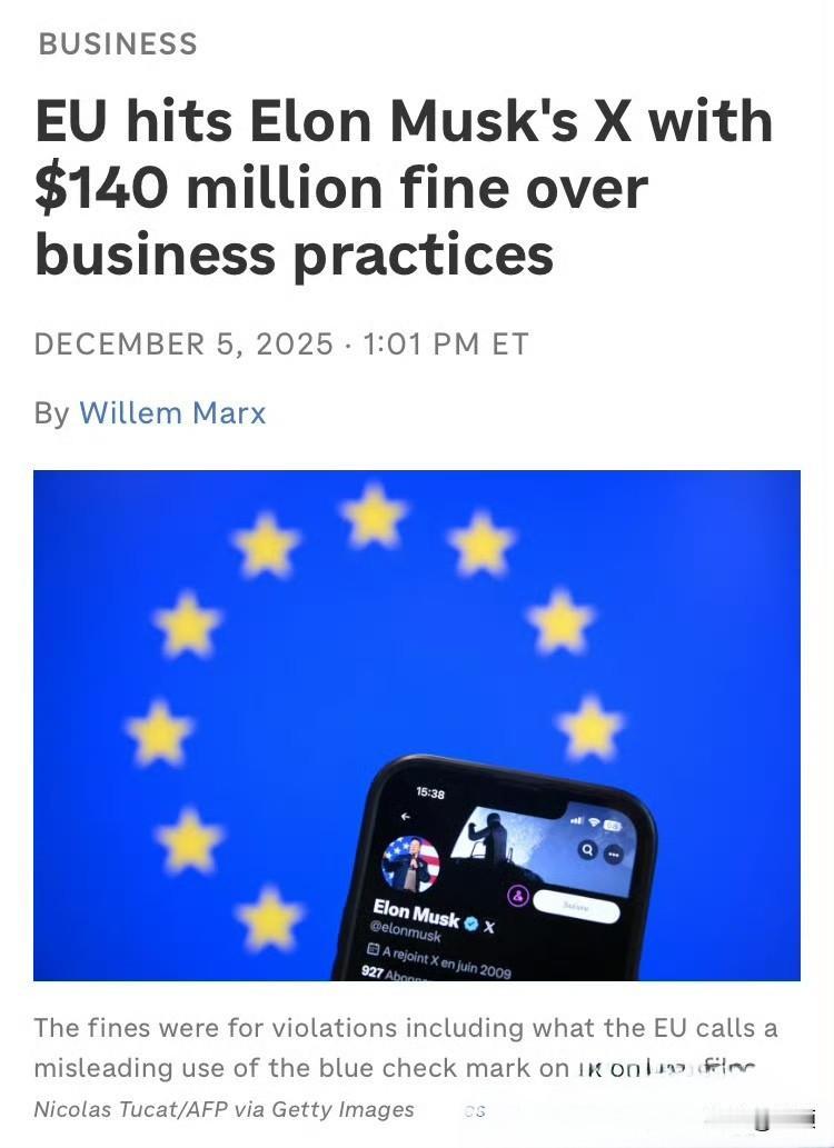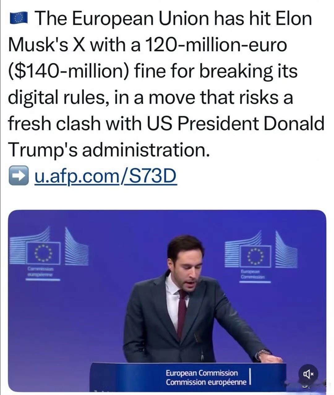 欧盟重罚X,马斯克怒喊“废除欧盟”…… 欧盟委员会依据《数字服务法》,对X平台处以1.2亿欧元(约合1.4亿美元)罚款,因为X平台多项违规行为,包括蓝标认证无需身份核验、广告资料库透明度不足、未向研究人员开放公共数据等,特别是没有进行内容审查。 罚单落地后,不差钱的马斯克反应激烈,怒斥处罚“荒谬疯狂”,还在X平台直言要“废除欧盟”,称欧盟是“官僚怪兽”,并表示将通过法律途径质疑罚款。美国多位高官也接连抨击欧盟,副总统JD·万斯直言欧盟罚款本质是攻击美国企业,应维护言论自由而非施压;国务卿鲁比奥、联邦通信委员会主席布伦丹·卡尔等也纷纷发声,指责欧盟针对美国科技企业,甚至将事件上升到意识形态层面。对此欧盟回应称,处罚仅针对违规行为,所有在欧运营大型平台均需遵守同一监管标准,与企业所属国家无关。
