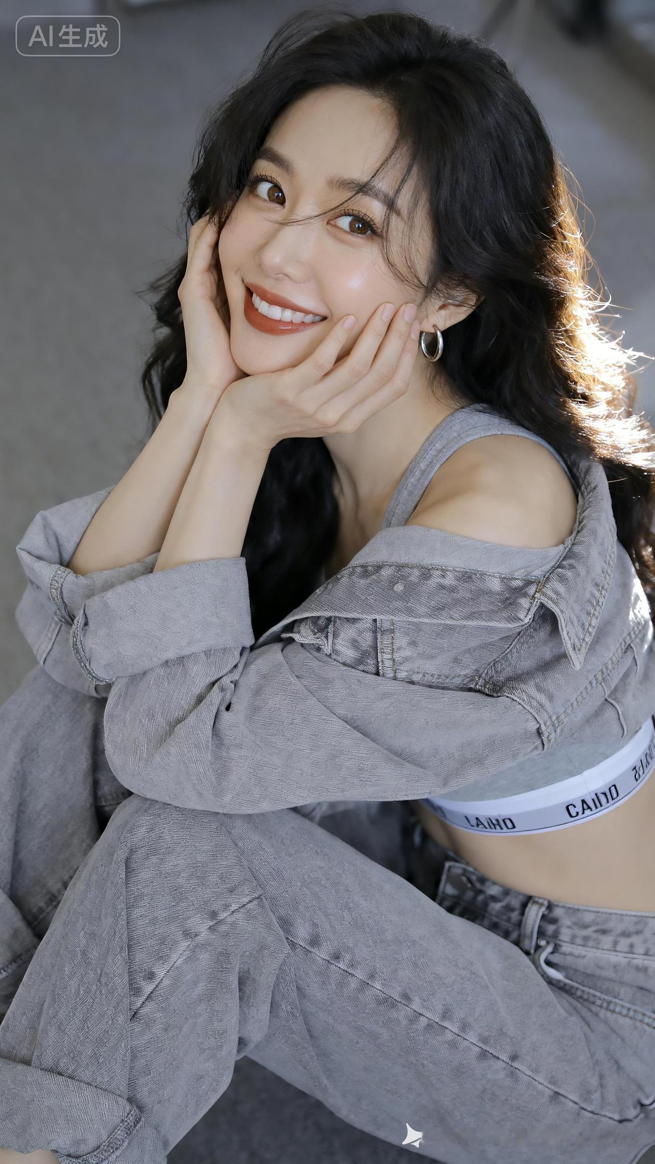 随性美女冷白皮鹅蛋脸甜酷勾唇笑,棕褐圆瞳配焦糖哑光唇,黑长微卷碎发轻拂。浅灰牛仔套装半披,露脐吊带显腰臀,撩人。