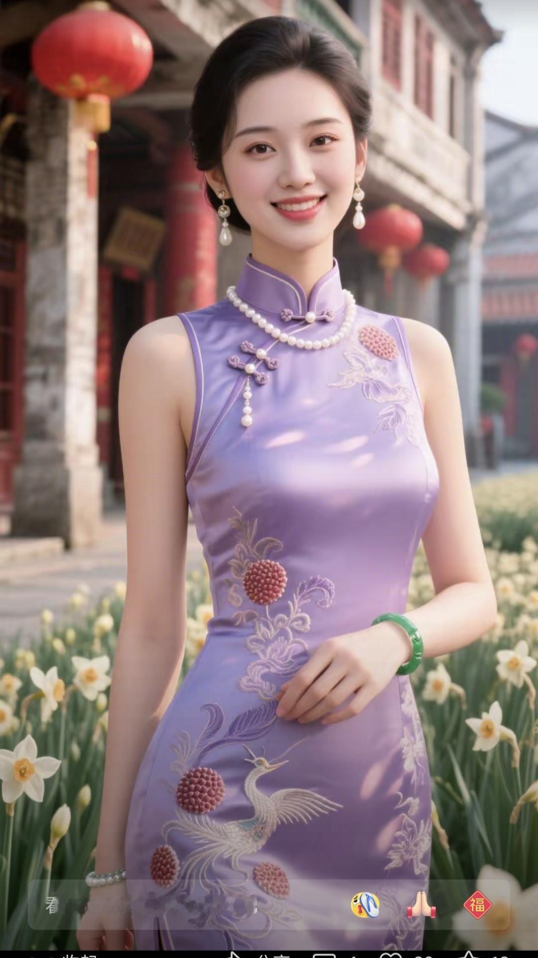 水仙子·紫韵旗袍佳人 紫袍轻裹韵芳华, 江南温婉映岁华。 东方雅致呈姿雅。 绸缎肩头挂, 鹤纹绣线飞呀。 扣绾温柔话, 珠摇意趣加。 静对仙葩。 青砖黛瓦映灯霞, 风掠青丝带馥嘉。 时光且慢喧嚣罢。 自悠然度岁呀, 展东方、风骨堪夸。 柔中藏坚韧, 眉间绽丽葩。 岁月生花。