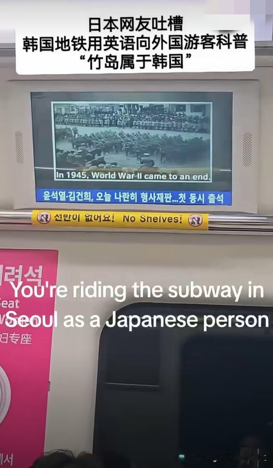 日本网友在外网发视频吐槽 ——韩国地铁屏幕用英语向外国游客科普“竹岛属于韩国,不属于日本” ,并称此现象已经出现了三年 。