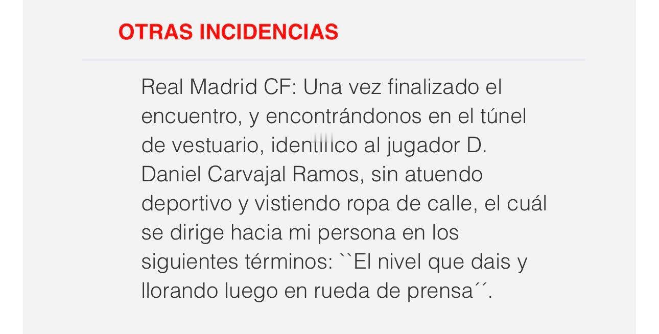 确认!恩德里克也被罚下场,原因:“他从替补席上起身,离开技术区,并向第四官员大声喊叫,教练组成员不得不将其拉开。”【裁判报告】卡瓦哈尔对裁判说:“这就是你展现出的水平,然后你们却在新闻发布会上哭诉。”西甲联赛皇马0比2塞尔塔halamadrid
