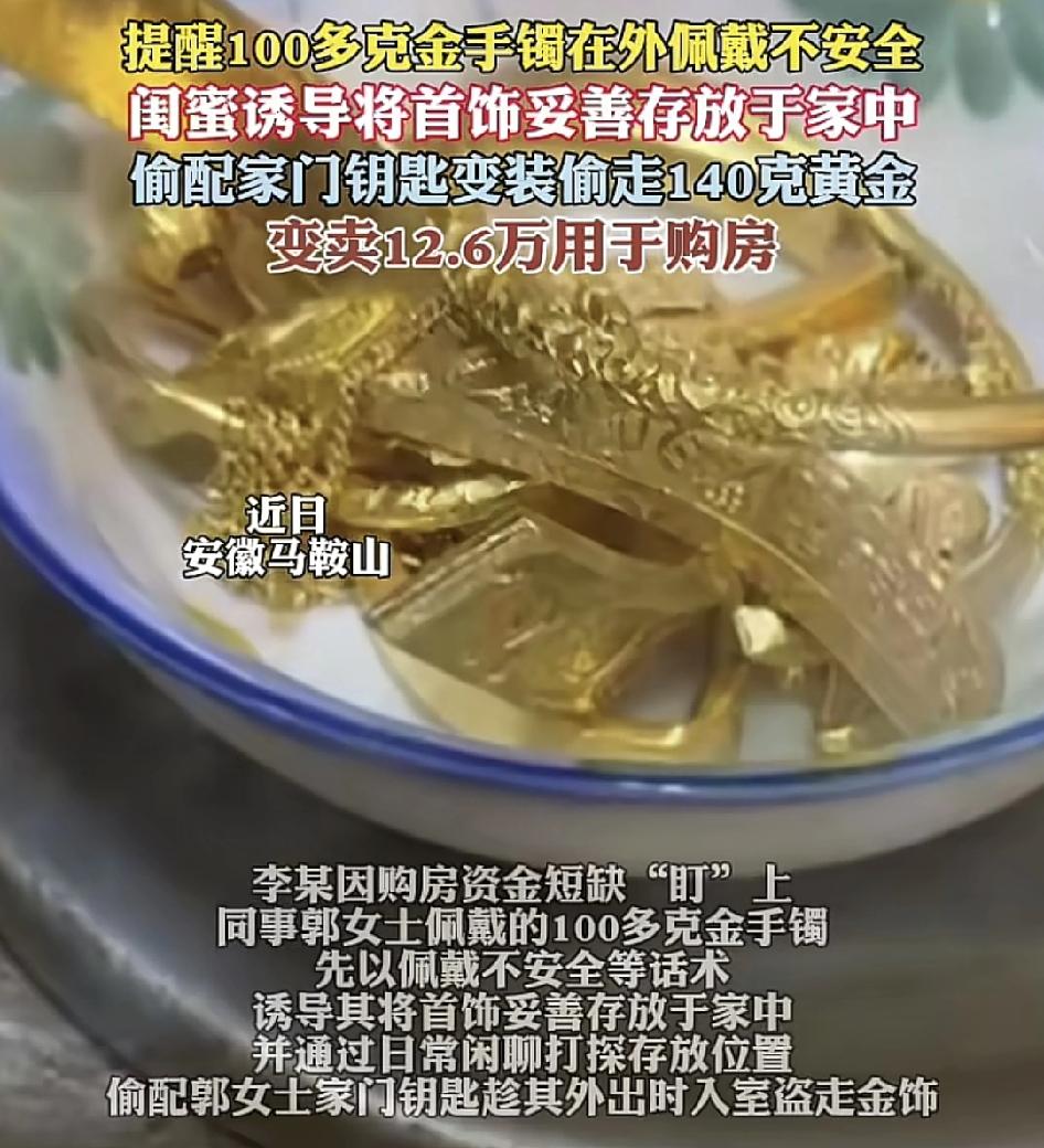 安徽马鞍山一女子因昕信闺蜜称100多克的金首饰戴在外面不安全,闺蜜骗她把首饰放在家里,并偷配女子家中的钥匙,并在多次闲聊中打探其放首饰的位置,然后趁其不在家进行盗窃,当天晚上还跟对方发视频试探,直到对方没有发觉之后就把黄金首饰变卖了12.6万元,女子把钱用于购房,不过最后已经被拘役和罚款。