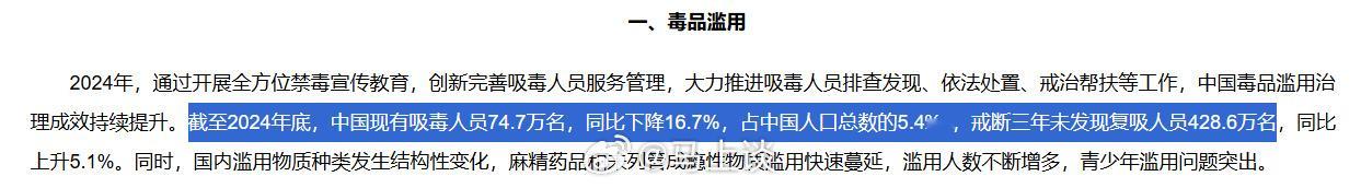 薛定谔般的复吸率:央视说一年复吸率88%,中国禁毒网说“2024年中国毒情形势报告”的数据:——截至2024年底,中国现有吸毒人员74.7万名,同比下降16.7%,占中国人口总数的5.4‱,戒断三年未发现复吸人员428.6万名(未直接提复吸率)。但按这个数据口径,戒断率其实是很高?所以,我也糊涂了…
