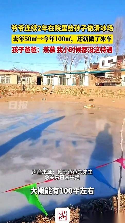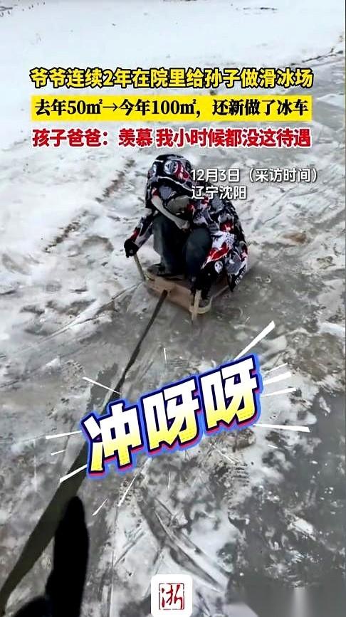 去年50平,今年直接干到100平。 你以为是啥开发商拿地呢?不是。 是一个东北爷爷,在他家院子里,给孙子造了个私人滑冰场。 我跟你说,这事儿乍一听,是宠孙子,觉得这爷爷动手能力真强,真硬核。 但你往深了想,后背发麻,眼眶子发酸。 去年搞了个50平的,发现孙子是爱来,但可能玩得还不够尽兴,屁股一拍还是走了。 今年呢?直接翻倍。100平。还自己焊了个小冰车。 这哪是滑冰场啊。 这100平,是那个老人用一个冬天,拿一院子的冰冷,小心翼翼“砌”起来的四个字: “你,多待会儿。” 他不会发微信说“孙子我想你了”,也不会打电话说“你什么时候再来啊”。 他的爱,笨拙得像他亲手浇冰的动作,又实在得像那零下十几度的天气。 我给你我最好的,我给你我能给的一切,我把我对你的思念,都变成你喜欢的东西。 只要能换你多陪我一会儿。 最绝的是孩子他爸,说自己小时候都没这待遇,羡慕。 你看,爱这个东西,真的会隔代遗传,而且还“通货膨胀”了。 上一代的亏欠感,在下一代身上,用加倍的、甚至有点“不计成本”的方式,补偿了回来。 这100平的冰,映出来的,是一个老人最简单、也最奢侈的愿望。