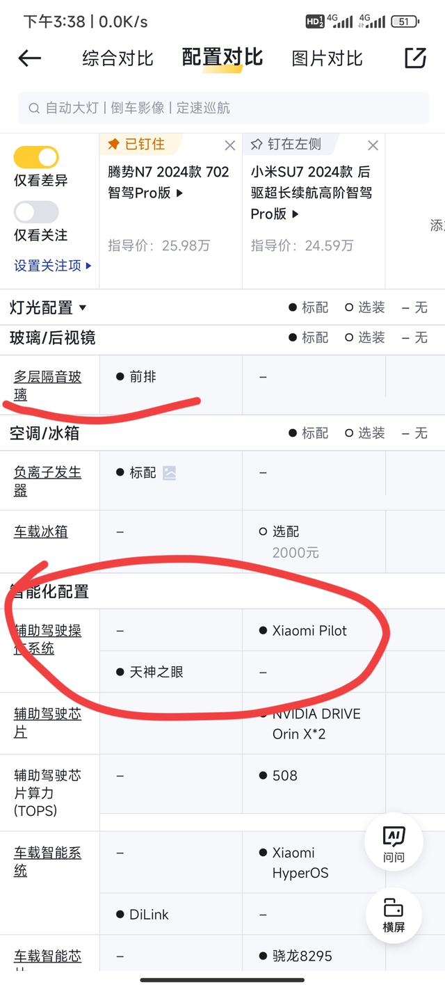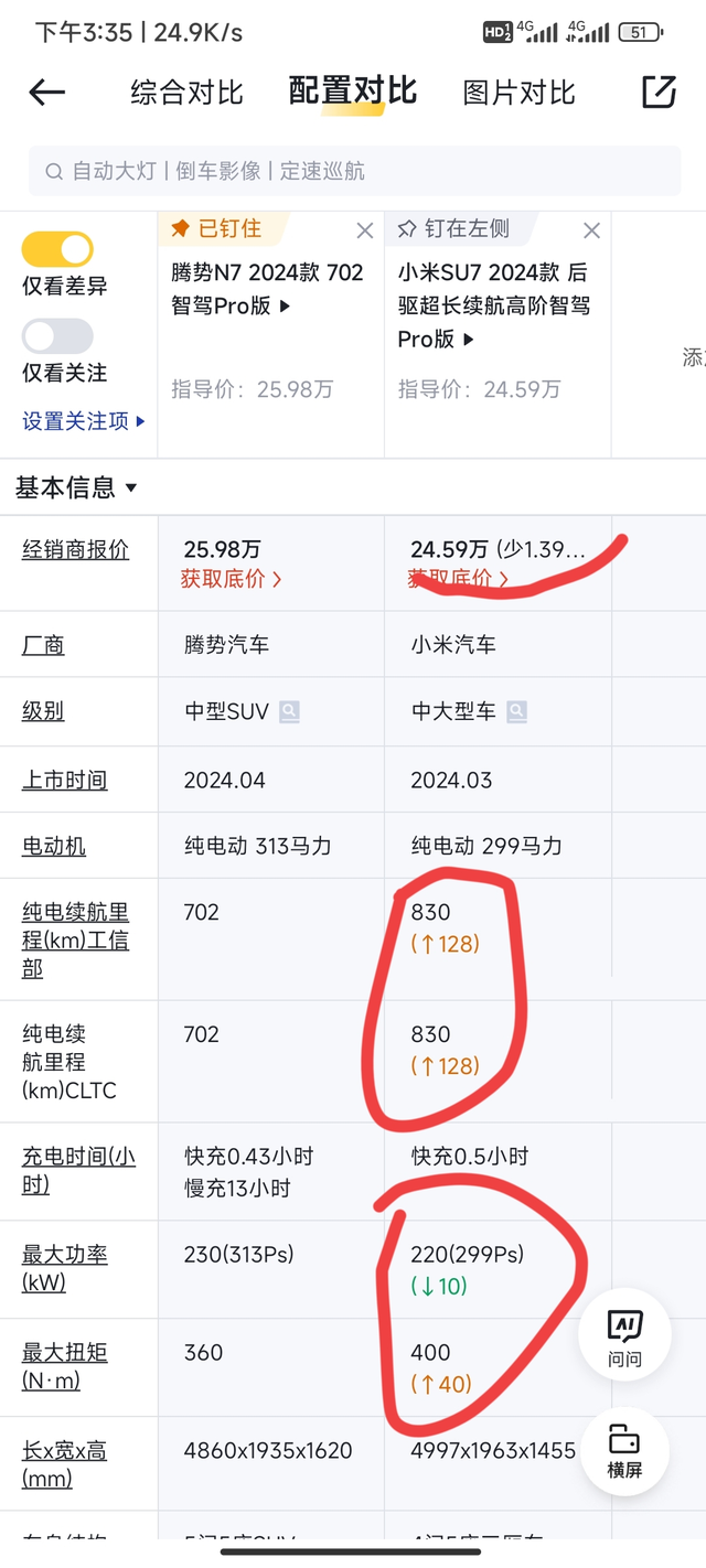 新腾势n7pro和小米Pro对比 1:小米价格上便宜一万四,续航多一百公里,电机扭矩更大 2:n7给了隐私玻璃,智驾方面应该略差 3:n7给配了魔毯智能悬架,软硬可调,对比亚迪最薄弱的底盘,有很大提升 4:小米外观更好,能治好你的社恐