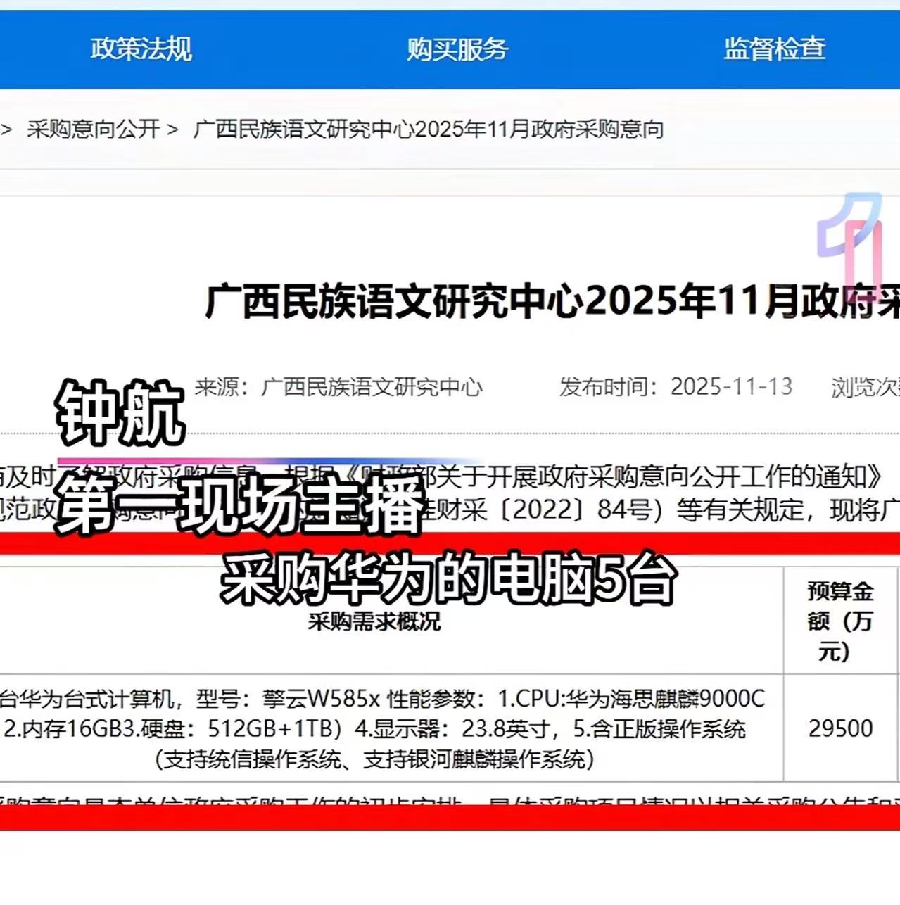 采购信息显示着,广西民族语文研究中心打算采购 5 台电脑,可这价格一栏,赫然写着高达2.95亿元!