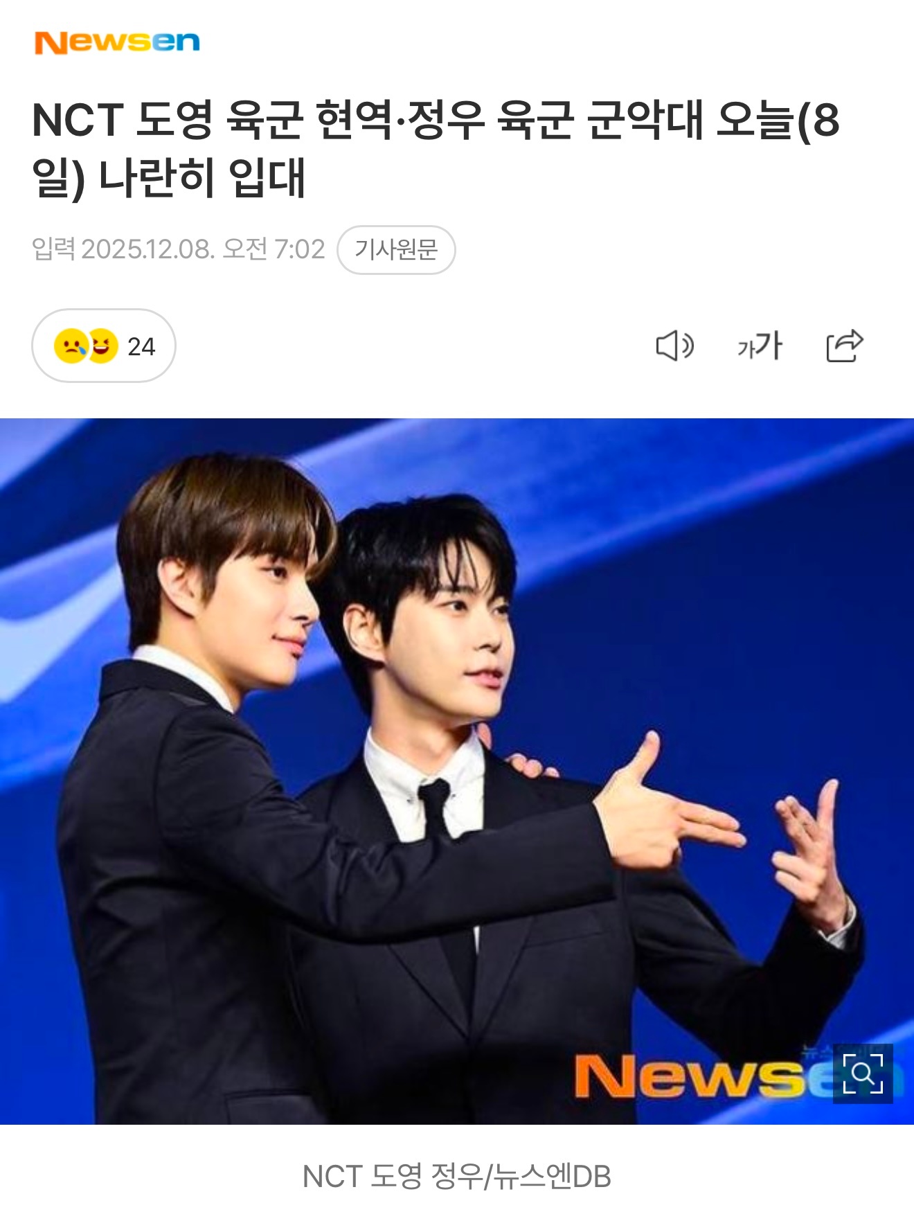NCT道英、廷祐今日将一同入伍。道英将作为陆军现役兵、廷祐将作为陆军军乐队开始服兵役。金道英金廷祐今日一同入伍