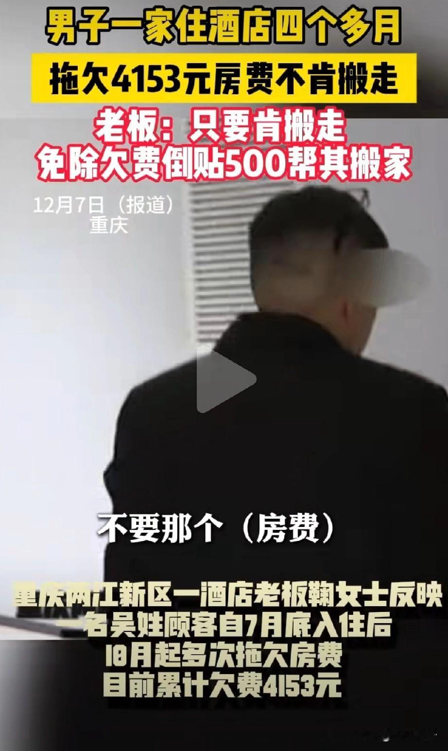 重庆一男子携老母亲、孩子住酒店4个月,欠近5000元房费拒不搬走。 酒店方曾主动提供援助(如赠送孩子牛奶、联系廉价房源),甚至让步至倒贴求搬走(免欠款+出500元搬家费),即便 如此该男子仍不为所动。原来他是为倒逼酒店起诉,借舆论施压法院,尽快解决自己十几万的欠款纠纷,还坦言认可酒店老板人品,并非恶意拖欠。 酒店退让被吴某视为谈判筹码。这种“以退为进”的方式是否可取?该男子将自身风险转嫁给无关联的酒店。警方曾介入但因顾及老人与儿童,未采取强制清退措施,导致酒店被迫要通过漫长诉讼维权。当欠债变成了 “有理”,当规则遇上了无赖,这出闹剧就这么荒诞地上演了。