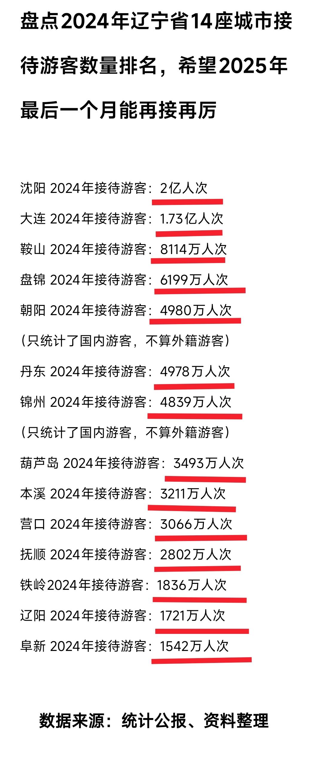 看来鞍山的旅游在辽宁省还是很不错的。如果能保持这样强势的发展势头我估计2025年鞍山与辽阳加起来的游客数量会突破1亿人次,届时辽宁省会形成旅游领域的第三增长极。 此外大家会发现朝阳最近几年旅游发展速度很快,现如今游客数量已经追上了锦州、丹东就足以说明一切。从这个细节可以看出便捷的交通让来朝阳旅游的京津冀地区游客数量大幅度增加,这是辽宁省很多城市无法媲美的。 相比之下本溪虽有丰富的旅游资源,却没有便利的交通配套,旅游景点都是在县城的郊区,市区缺少旅游景点与大型酒店。因此来本溪游玩的外省游客比例并不高,希望今后能加把劲。