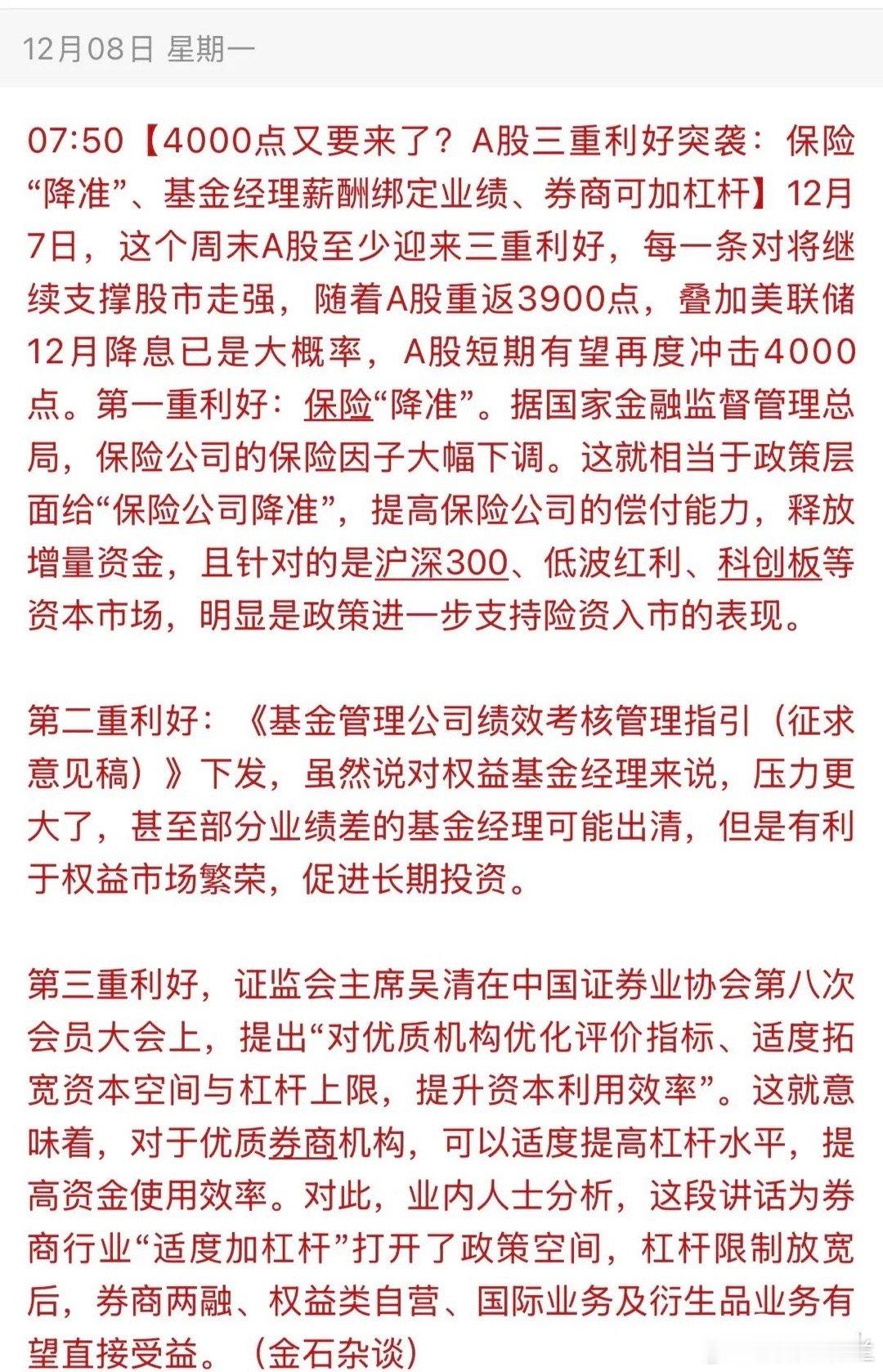 早评: A股马上就要开盘了,对于今天的行情,我再重点分享几个观点第一,上周五美股三大指数收十字星的走势,据我观察,美股短线接下来或者还有2~3天的上行空间。第二, A股周五走出了量价齐升的实体明显阳线走势,虽然A股今天面临多重压力位,但是预计今天或者还能走出一颗小阳线。 第三, A股今天的压力点在3922点附近,而本周的中极压力点在3967点附近。情况理想的情况下,A股接下来有望反弹到3967点附近。第四,预计本周将会走出“先扬后抑”的走势。预计本周能够上涨的时间,大概是2~3天的样子,然后会进入到震荡整理。第五,方向方面文化传媒,AI应用,机器人或有一定的短线表现。白酒板块经过连续大跌之后,短线具备估值修复空间。以上仅仅代表我个人对于市场的一些粗浅的见解,我的观点不一定正确,仅供大家讨论市场走势之用,不代表任何投资建议。