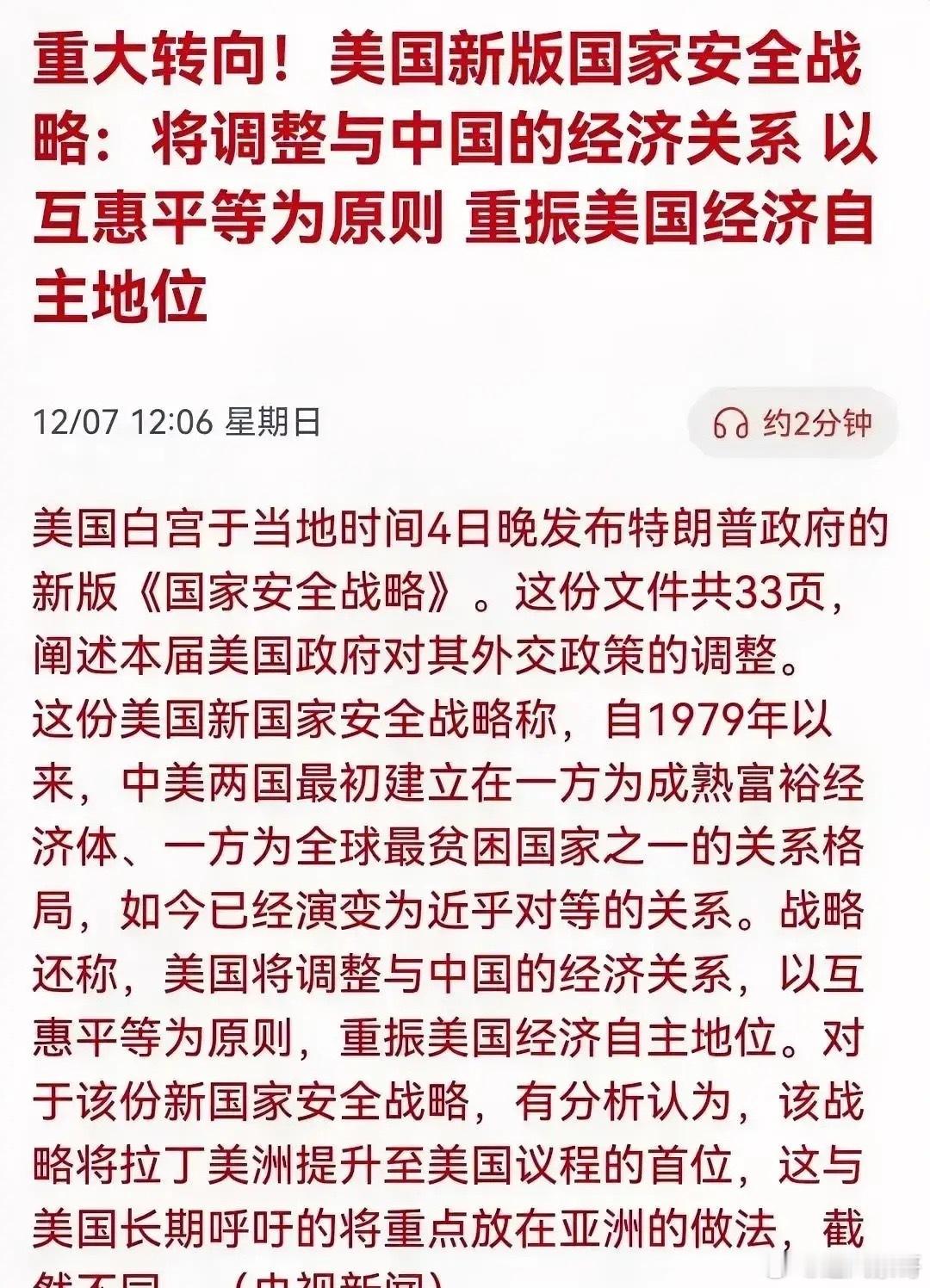 大利好!今天必定一根大阳线!美国新版国家安全战略的调整,对中国的影响呈现“短期摩擦与长期机遇并存”的特点:1. 经贸层面:美国以“互惠平等”调整对华经济关系,短期可能缓和部分消费品关税,但高端技术(半导体、高端制造)领域的供应链脱钩、技术管制仍会延续,倒逼中国出口企业优化结构、向高附加值领域转型。2. 产业层面:美国推动“经济自主”将加速中国半导体、工业母机、高端装备等领域的国产替代,政策与资金会进一步向自主可控赛道倾斜,新质生产力相关产业的商业化进程将提速。3. 区域层面:美国将重心转向拉美,既分散了其在亚太的战略资源,让中国在亚太的合作空间有所拓展;也推动中拉基建、物流合作深化,但中拉项目可能面临美国的间接干预。4. 内需层面:美国供应链脱钩的压力,会强化中国对内需市场的依赖,消费升级、设备更新等政策红利将持续释放,内需型企业的业绩确定性提升。受益概念股梳理1. 北方华创:半导体设备龙头,覆盖刻蚀机、PECVD等核心设备,国产替代率持续提升,受益于美国供应链脱钩倒逼的自主化需求。2025年三季报营收增35%,绑定中芯国际等头部晶圆厂,大基金支持下技术突破加速。2. 拓荆科技:国内唯一能量产PECVD的薄膜沉积设备商,半导体国产替代核心标的,订单已排至2026年。2025年营收增58%,获大基金三期投资布局三维集成设备,客户包括中芯国际、华虹半导体。3. 华中数控:工业母机数控系统龙头,“华中10型”集成AI芯片,市占率达18%,已切入中国商飞供应链。受益于美国制造业回流倒逼的国产设备替代,2025年订单量同比增35%,政策补贴增厚利润。4. 科德数控:五轴机床标杆,自主化率85%,加工精度达3μm,军工订单占比超40%、毛利率52%。受益于高端制造自主可控及军工装备升级,2025年北向资金增持,券商给予“买入”评级。5. 中远海控:持有秘鲁钱凯港60%股权,该港是中拉物流枢纽,可将中拉运输时间从45天缩至23天。受益于美国拉美议程下的中拉贸易增长,2025年钱凯港一期运营后吞吐量将达100万标箱。6. 中国交建:主导钱凯港、两洋铁路等中拉基建,拉美市场占有率超30%。受益于美国重心转拉美后的中拉合作深化,2025年海外订单占比预计达40%,当前市盈率仅6倍,估值修复空间大。7. 汇川技术:高端装备核心部件龙头,覆盖工业自动化、新能源电控,客户包括三一重工、宁德时代。受益于新质生产力政策及美国供应链脱钩下的国产替代,2025年三季度营收增21%。8. 秦川机床:机器人滚珠丝杠核心供应商,突破P2级技术,成功供货特斯拉人形机器人。受益于人形机器人商业化及美国高端制造竞争下的国产替代,2025年三季度营收增12%,产能扩张稳步推进。9. 天岳先进:碳化硅衬底龙头,6英寸产能利用率95%,8英寸产品已小批量出货。受益于新能源汽车功率器件需求及美国半导体材料限制下的国产替代,2025年营收增48%,毛利率达42%。10. 盛美上海:清洗设备全球第四,市占率8%,国内单片清洗设备市占率超30%,拓展炉管、涂胶显影设备。受益于半导体国产替代,2025年净利润增67%,定增募资44.82亿元加码研发。11. 中际旭创:全球光模块龙头,800G产品占英伟达供应链40%份额,泰国工厂规避贸易壁垒。受益于美国AI算力需求及关税缓和,2025年北美订单占比提升,业绩弹性充足。12. 立讯精密:苹果AirPods代工龙头,对美出口占比超40%,关税每降10%可增厚净利润5%-8%。同时切入AI硬件供应链,受益于美国关税缓和及消费电子复苏,订单量稳步增长。13. 顺丰控股:综合物流龙头,高端时效件需求增长,受益于内需消费复苏及中拉贸易物流增量。2025年全国快递业务量破1800亿件,公司自动化降本增效显著,利润率持续改善。14. 中国中免:免税龙头,受益于扩内需政策及海南自贸港红利,美国重心转拉美后国内消费升级动力增强。2025年政策放宽外资准入,免税业态与文旅融合加速,业绩增长确定性高。15. 宁德时代:动力电池全球市占率37%,美国储能市场依赖度55%,泰国工厂规避关税。受益于美国新能源需求及供应链多元化,2025年海外订单增势强劲,储能业务成第二增长曲线。