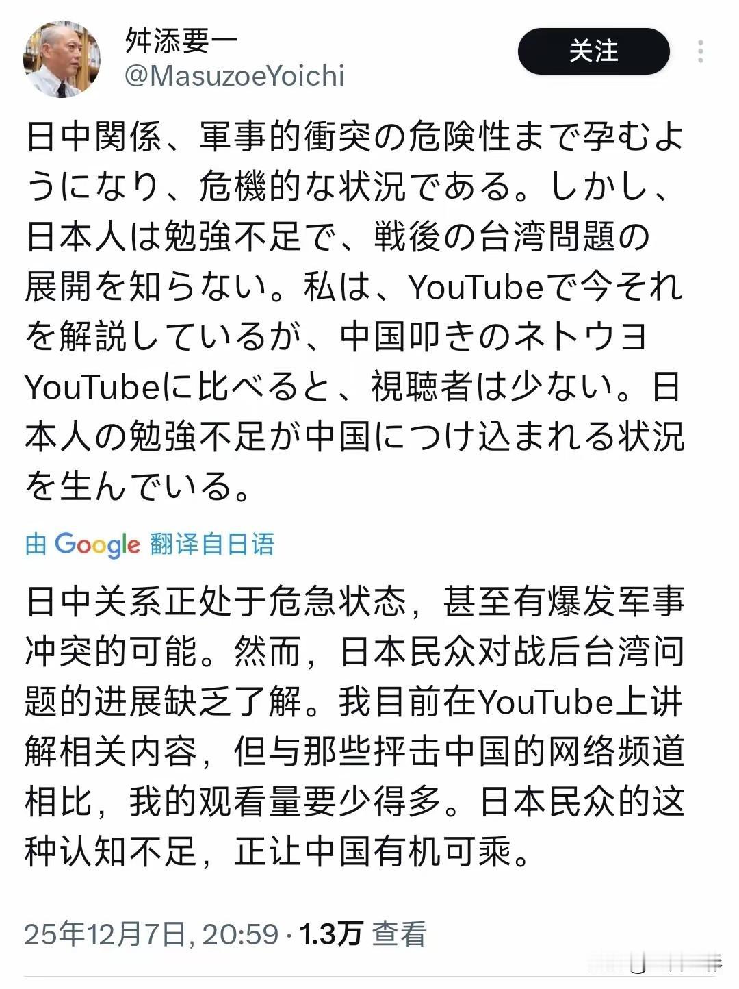 昨晚有个事儿挺有意思。一位叫舛添要一的日本前高官在网上发文,说中日关系现在很危险,可日本老百姓对台湾问题怎么回事儿,根本弄不明白。他还说了个挺无奈的对比:自己认真做视频讲这些,根本没人看,可那些天天骂中国的频道,却火得不行。他觉得,这种“无知”让中国钻了空子。你看,这话乍一听有点道理,像是呼吁大家多了解真相。但仔细一想,逻辑的窟窿就露出来了:他把两国关系紧张的锅,甩给了本国老百姓“不懂”,还暗示中国在利用这一点。可台湾问题纯属中国内政,这根本就不是一个能让你“懂”或“不懂”、然后决定站哪边的选择题。真正关键的点被他绕过去了:如果想避免冲突,日本方面需要审视和约束的,恰恰是那些不断挑战红线、干预中国内政的政治行为,而不是去责怪观众为什么不爱看自己的科普节目。这个例子恰恰说明,某些看似理性的日本声音,其实依然困在一种思维的围墙里——他们忙于解释“我们为何误解”,却不愿面对“我们是否做错”。