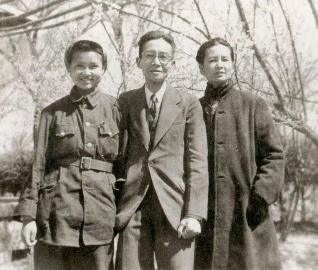 这张照片,是1949年梁再冰即将南下投身工作前,与父亲梁思成、母亲林徽因拍摄的临行留念。 中间的梁思成身着挺括西装、佩戴标志性眼镜,神态温和从容,尽显学者的儒雅气质;左侧的梁再冰(时年约20岁)身着军装风格的制服,束腰设计让造型更显干练,眉眼间满是青年投身事业的朝气,右侧的林徽因此时已受长期肺病困扰,身形略显清瘦,但身着长款大衣的她,依旧保持着一贯的端庄舒展。