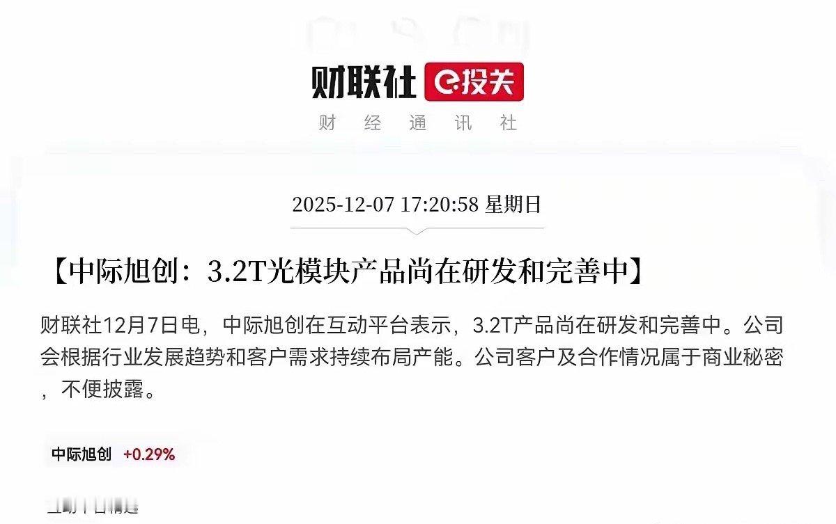 中际旭创要起飞了!晚间中际旭创突发利好消息了预计明日中际旭创有望高开高走,不出意外的话,要突破前高558.77元再创历史新高了…今日据财联社消息,中际旭创在互动平台上表示,公司3.2T光模块产品正在研发和完善中,这预示着3.2T光模块很快就要面向市场量产了,市场对于这款新产品期望很高,市场需求量巨大,据说3.2T光模块是未来数据中心升级的关键技术,具有广阔的市场前景,非常值得期待,这将会是中际旭创打开增长的又一王牌产品,这对于中际旭创来说是重大利好股民们,坐稳扶好,受此利好消息刺激,明日中际旭创要大爆发了,千万不要被甩下车了,中际旭创目标价有望突破700元…