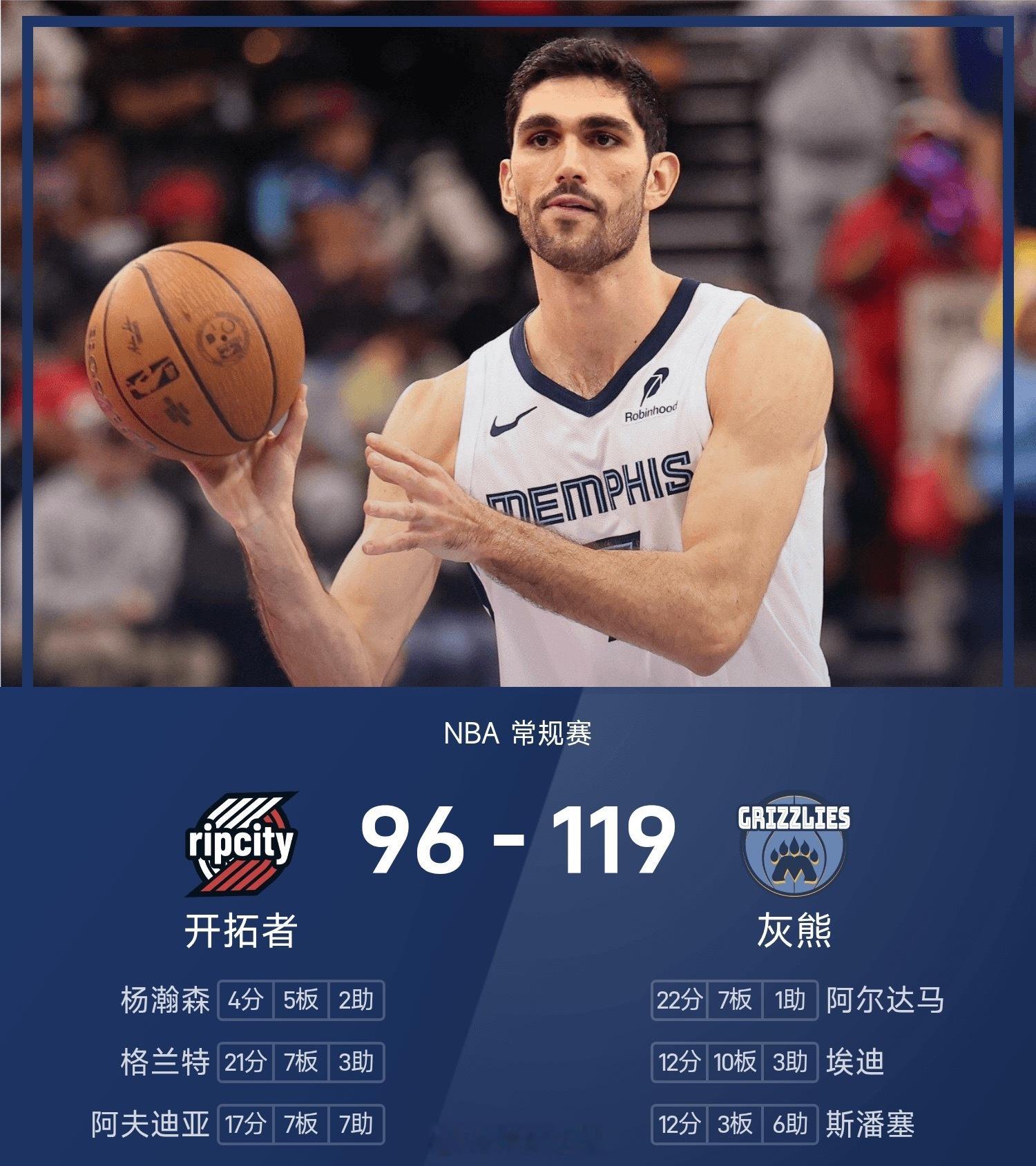 25/26赛季NBA 常规赛,灰熊对阵开拓者。双方全场战罢,灰熊119-96战胜开拓者。阿尔达马砍下全场最高的22分7板1助,率领灰熊成功取胜。杨瀚森首发出战19分13秒得到4分5篮板2助攻。