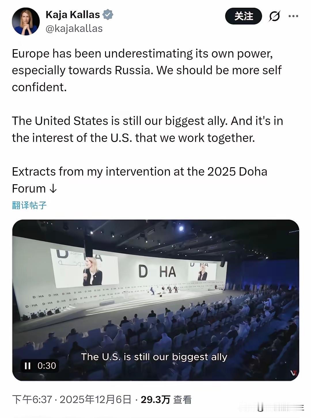 你说美国要抛弃我们,我怎么觉得美国还是我们的坚定盟友,只不过是让我们先上前台,他在背后继续支持我们,这是我们最大的共同利益。这就是卡拉斯的神逻辑! 面对记者关于“美国国家安全报告”的提问,作为欧盟外交、安全高级代表的卡拉斯是这样认为的。明明人家已经要跟你切割了,可自己还认为双方是最坚定的盟友。 不仅当场回答的这么自然,事后还发推再一次证明自己的观点,欧洲这群高官估计也就是这水平了。人家已经说了自己管自己家的后院,她还自认为人家会坚定支持她,你觉得可笑不可笑。