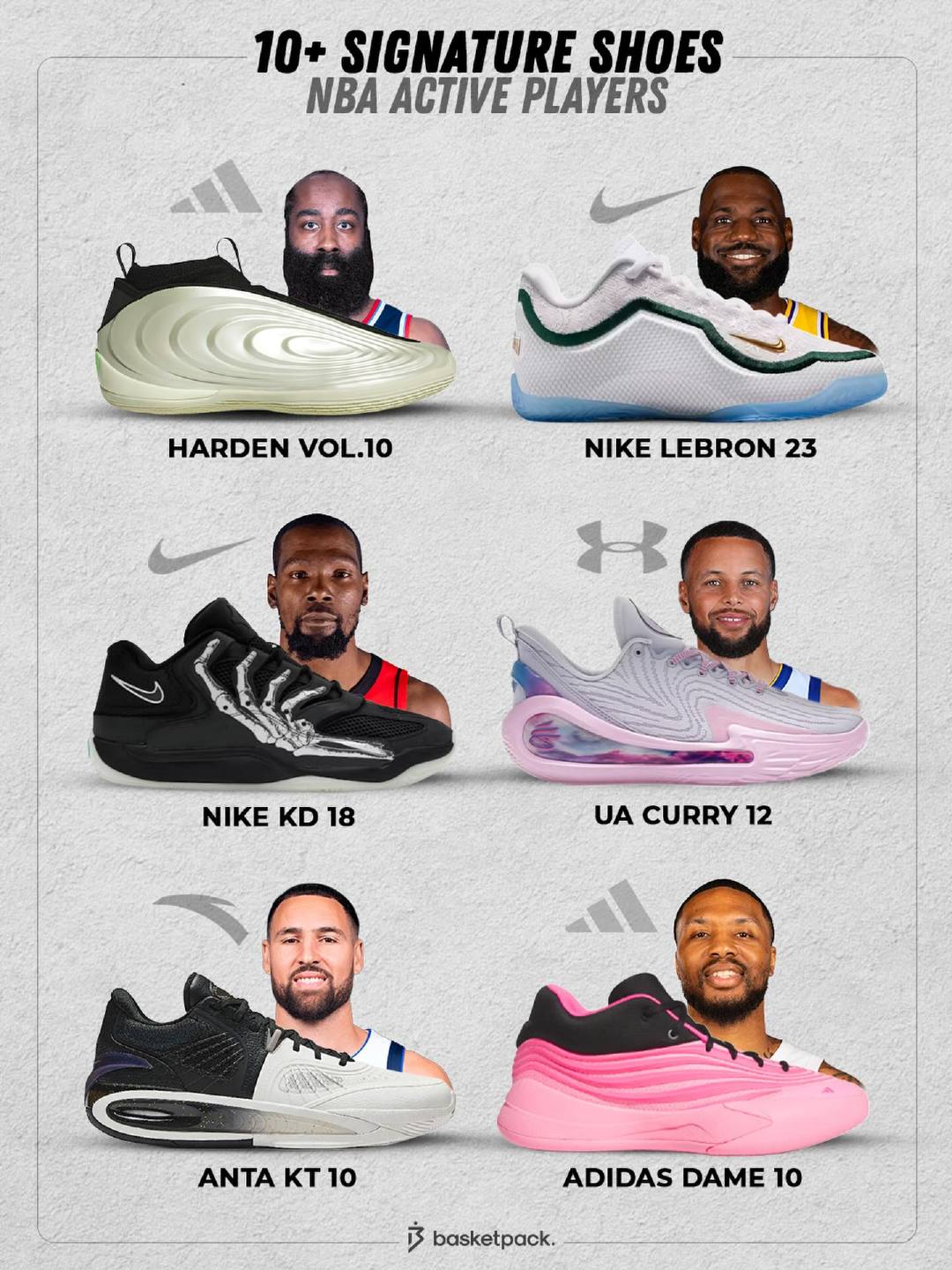目前NBA仅有的6位签名鞋还在推出且已超过10代的球星:杜兰特 - 18哈登 - 10詹姆斯 - 23库里 - 12(完结)克莱 - 10利拉德 - 10新赛季篮不住休斯顿火箭
