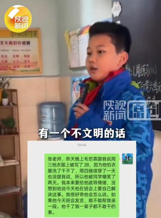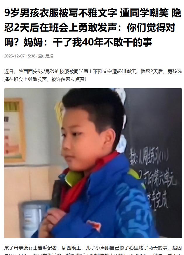 西安,一9岁男孩的校服背后被人写了“2B”,妈妈知道后,说要去学校讨个说法,没想到,男孩却说:“我自己能解决!”第二天,他的做法让无数人为之点赞! 校园里总有一些看似无伤大雅的恶作剧,却在不知不觉中触碰着他人的底线。 西安一名9岁男孩的遭遇,就撕开了这类“玩笑”背后的隐性伤害,而他用自己的方式,给出了最有力的回应。 周三清晨的校园里,一阵指指点点的议论声传到男孩耳中,同学无意间的提醒让他得知,自己的校服背后被人写下了“2B”两个字。 他试着抬手去摸,却什么也看不清,性格内敛的他不好意思当众查看,只能压下心头的羞愤,默默走进教室上课。 接下来的两天,这份尴尬逐渐发酵,体育课上,越来越多同学看到了校服上的字迹,有人故意跟在他身后起哄,有人捂着嘴指指点点,嘲笑的声音像影子一样甩不掉。 到了周四,这样的嘲弄变本加厉,男孩的心里又酸又胀,却始终没在学校哭闹或找老师求助。 放学回家后,男孩曾想立刻把校服洗干净,可墨水已经渗进布料,怎么搓洗都无法去除。 眼看时间不早,他担心衣服晾不干,第二天没法正常上学,只能放弃清洗的念头。 更重要的是,他不想让妈妈为自己操心,纠结再三,直到周四晚上,憋了两天的他才终于小声把事情告诉了妈妈。 妈妈得知真相后,心疼得无以复加,当即就想抓起手机联系班主任,替儿子讨个说法。 让她没想到的是,这个9岁的孩子却拉住了她,语气坚定地表示,这件事他要在周五的班会上自己解决。 看着儿子笃定的眼神,妈妈强压下心中的火气,最终选择相信孩子的能力。 她没有直接找老师“兴师问罪”,而是悄悄和班主任取得联系,拜托老师帮忙记录下孩子处理事情的过程,把解决问题的主动权完完全全交给了儿子。 周五的班会课上,在班主任的鼓励下,男孩走上了讲台。 他没有哭哭啼啼,也没有点名指责任何人,只是平静地看着全班同学,诉说着这两天被嘲笑的感受。 他问大家,如果这样的字迹写在别人的校服上,让别人被指指点点,当事人会开心吗?他还提到,平时班里同学遇到困难,自己总会主动帮忙,他愿意付出善意,也希望能得到同等的尊重。 这番话让教室里瞬间安静下来,连呼吸声都清晰可闻。 几秒钟后,那个在校服上写字的同学涨红了脸,当场站起来向男孩道歉,之后还主动把那件脏校服带回家,洗得干干净净。 其他曾经跟着起哄的同学也纷纷低下头,表达了自己的歉意,全班同学不约而同地鼓起了掌。 班主任把班会的视频发给了男孩的妈妈,看完视频后,妈妈忍不住热泪盈眶。 她从未想过,自己的孩子能如此沉稳勇敢,这份面对不公时的理智与坚定,是很多成年人都未必具备的。 这件事被分享到网上后,迅速引发了众多网友的关注。 大家纷纷为男孩点赞,有人说他用温和却有力的方式维护了自己的尊严,也有人感慨,他给所有孩子上了生动的一课。 男孩在班会上的勇敢反击,格外令人动容。 他没有选择忍气吞声,也没有用激烈的方式激化矛盾,而是用换位思考的真诚,唤醒了同学们的同理心。 这种不卑不亢的态度,既守住了自己的底线,也给犯错的同学留足了台阶,展现出远超年龄的成熟与智慧。 校园里的相处,从来都离不开尊重二字。 那些看似随意的恶作剧和起哄,可能会给他人带来长久的心理伤害。 而这个9岁男孩用自己的行动证明,面对不公,勇敢发声不等于针锋相对,理性沟通往往更有力量。 他的故事,也让我们看到,成长路上的矛盾与挫折,从来都不是阻碍,而是培养解决问题能力的契机。 今天的分享到这里就结束了,大家对此事有何看法,欢迎在评论区留言和讨论,感兴趣的可以点击头像加关注,我将每日更新优质内容,我们下期见。