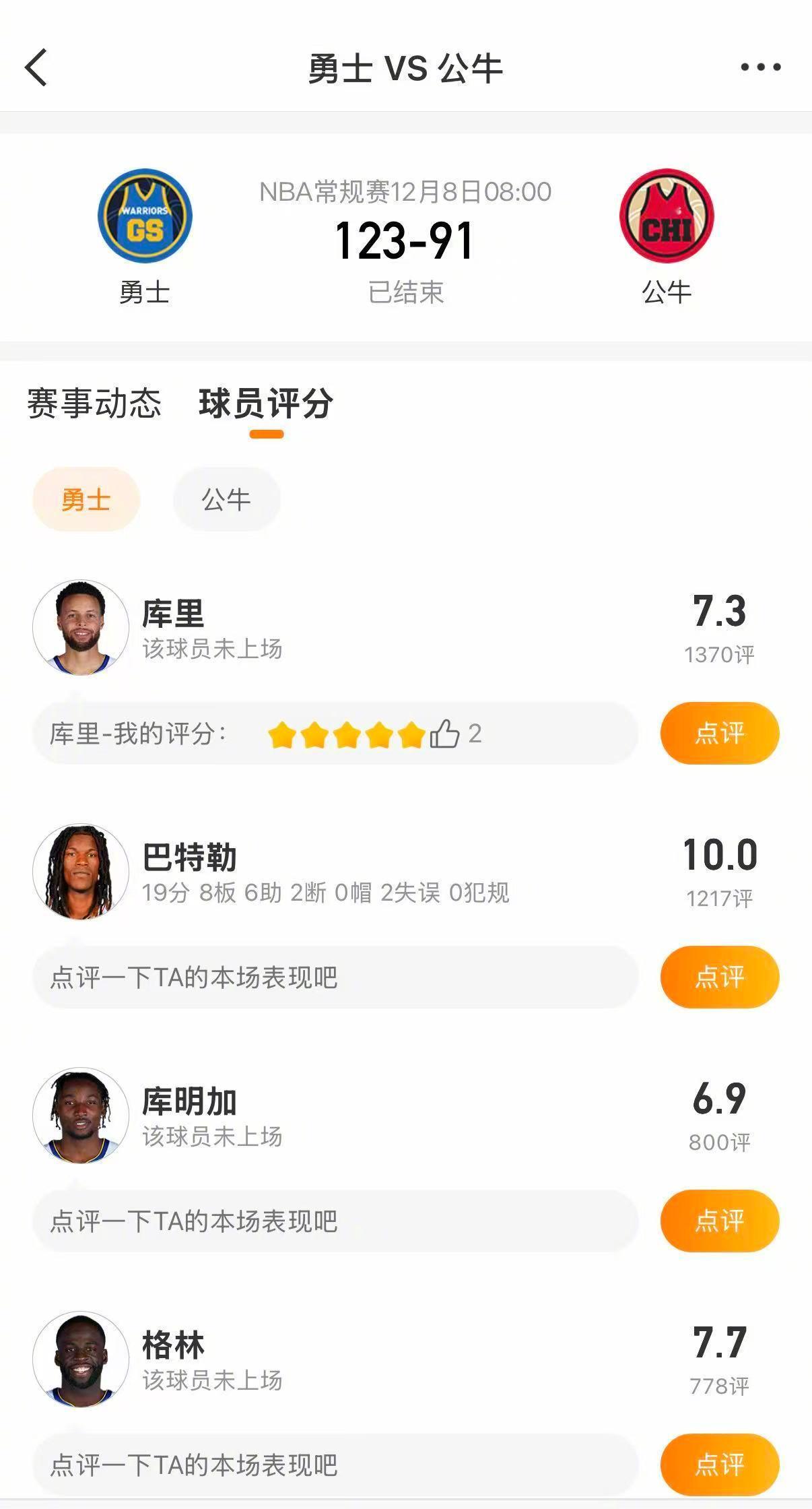 勇士背靠背大胜公牛 勇士123-91大胜公牛。库里继续缺阵,波杰姆斯基21分,巴特勒19分8篮板6助攻,波斯特19分。公牛方面,吉迪18分,布泽利斯16分。进入球队超话金州勇士 和芝加哥公牛 为球员今天的表现进行评分吧!