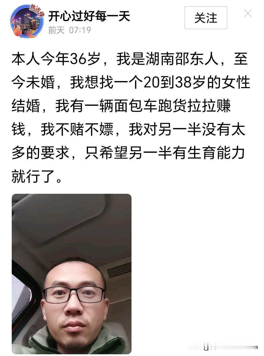 大家觉得这要求高吗? 就要求女方年龄20至38岁这条,恐怕就很难。 真心建议这位兄弟把女方年龄放宽到40岁左右,并且做好找离过婚的心理准备吧。
