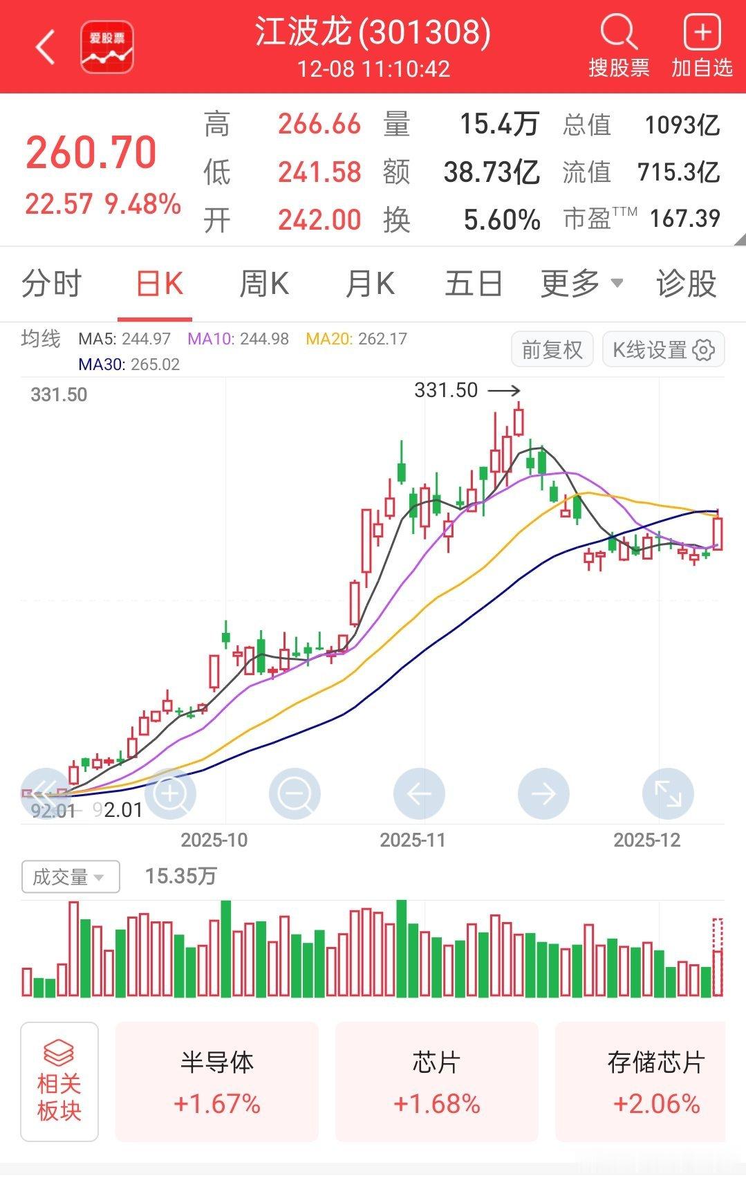 看图说话,高抛低吸的江波龙今天一飞冲天了,真给力阿,从246开始到今天260了,舒服