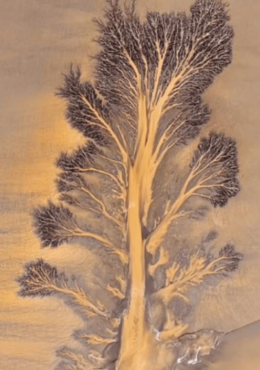 解释不清了!浙江一男子用无人机拍钱塘江退潮,没想到,无人机刚一起飞,就拍到了罕见一幕,堪称大自然的杰作,钱塘江退潮惊现“潮汐树”,枝杈分明、脉络清晰,宛如一幅浑然天成的水墨丹青。网友:还好李白没看到,要不然又有几首诗要背了。 最近,一段钱塘江退潮的视频在网上火得一塌糊涂,几百万网友都被这难得一见的自然景象给惊艳到了。 退潮后的滩涂上,没有杂乱的淤泥,反而铺开一片“树影”,黑褐色的滩涂当画布,亮晶晶的水痕做枝丫,活脱脱一幅天然的水墨丹青。 这就是科考队员证实过的“潮汐树”奇观,连人民日报都转发了,让这份大自然的礼物更有分量。 浙江小伙阿杰是个实打实的无人机迷,平时总爱扛着设备往钱塘江跑,就想拍点别人没见过的景致。 那天风挺大,他特意查了潮汐表,赶在大潮期的退潮时间往江边赶。 风裹着淡淡的鱼腥味吹过来,把他的头发吹得乱七八糟,手里的遥控器得使劲攥着才不会滑掉。 无人机刚飞起来的时候,只是江水裹着泥沙慢慢退去,露出一大片湿漉漉的滩涂,看着和普通泥地没两样。 阿杰正想调个角度找找看点,没想到无人机一升高,屏幕上的景象突然让他挪不开眼。 原本平平无奇的滩涂上,竟然冒出了密密麻麻的纹路。 粗壮的主纹路从江边往滩涂里头伸,走一段就分出几条分支,分支再往外岔出细细的末梢,一层一层的,跟大树的枝干一模一样。 阳光洒下来,湿润的淤泥是深褐色的,沟槽里剩下的江水泛着细碎的光,亮处和暗处交织着,既有国画那种飘逸的感觉,又有书法笔锋的劲道。 更有意思的是,几只小螃蟹在细纹路旁边的水洼里爬来爬去,爪子扒拉着淤泥,给这幅静悄悄的水墨画添了点活气。 阿杰当时激动得赶紧操控无人机从各个角度拍,这片潮汐树占了足足几十亩地,一眼望不到头,看着心里特别敞亮。 可这美景留不住,就二三十分钟的功夫,下一波潮水一冲就没了,能完整拍下来,真是撞大运了。 这段配着“钱塘江退潮,拍到神仙级画面”的视频一上网,评论区立马热闹起来。 有网友开玩笑说:“还好李白没看着这景象,不然他肯定诗兴大发,写个十首八首的,咱们课本又得加页了”。 还有人羡慕道:“我去钱塘江好几次,每次都只看到一堆泥巴,没想到退潮后藏着这么好的风景,这无人机买得太值了”。 潮汐树可不是一天两天能形成的,是大自然用了千万年慢慢雕出来的,它不是真的树,是潮水长期冲刷出来的沉积地貌。 涨潮的时候,钱塘江的潮水裹着好多泥沙漫上滩涂。 而且想见到潮汐树可不容易,条件特别苛刻。 得是农历初一到初五、十五到二十的大潮期,潮差得够大,天气还得晴朗,泥沙也得稳定,少一样都不行。 就算是常年在江边干活的老渔民,也未必能经常见到这么完整的潮汐树。 更难得的是,这“树林”不光好看,还是个小生态乐园,沟槽里的残水有营养,能养活小螃蟹、小贝壳,还能吸引候鸟来吃东西,颜值和用处都占了。 不少网友看完视频都感慨,以前只知道钱塘江涨潮的时候特别壮观,没想到退潮后还有这么温柔的惊喜。 生活里的美好一直都在,就是咱们总忙着赶路,没心思停下来看看。就像这潮汐树,藏在退潮后的滩涂里,得有耐心等、细心找才能遇见。 美景就跟人生一样,那些突然而来的惊喜,往往都是长时间积累和等待来的。 潮汐树用了千万年的潮起潮落,才长出自己的样子,咱们过日子,也不妨放慢点脚步,多留点心思观察身边的事物。 说不定在某个普通的日子里,就能撞见大自然偷偷画下的珍贵景致。 下次路过江边、海边,不妨多等一会儿,看看退潮后,会不会有意外的惊喜在等着自己。