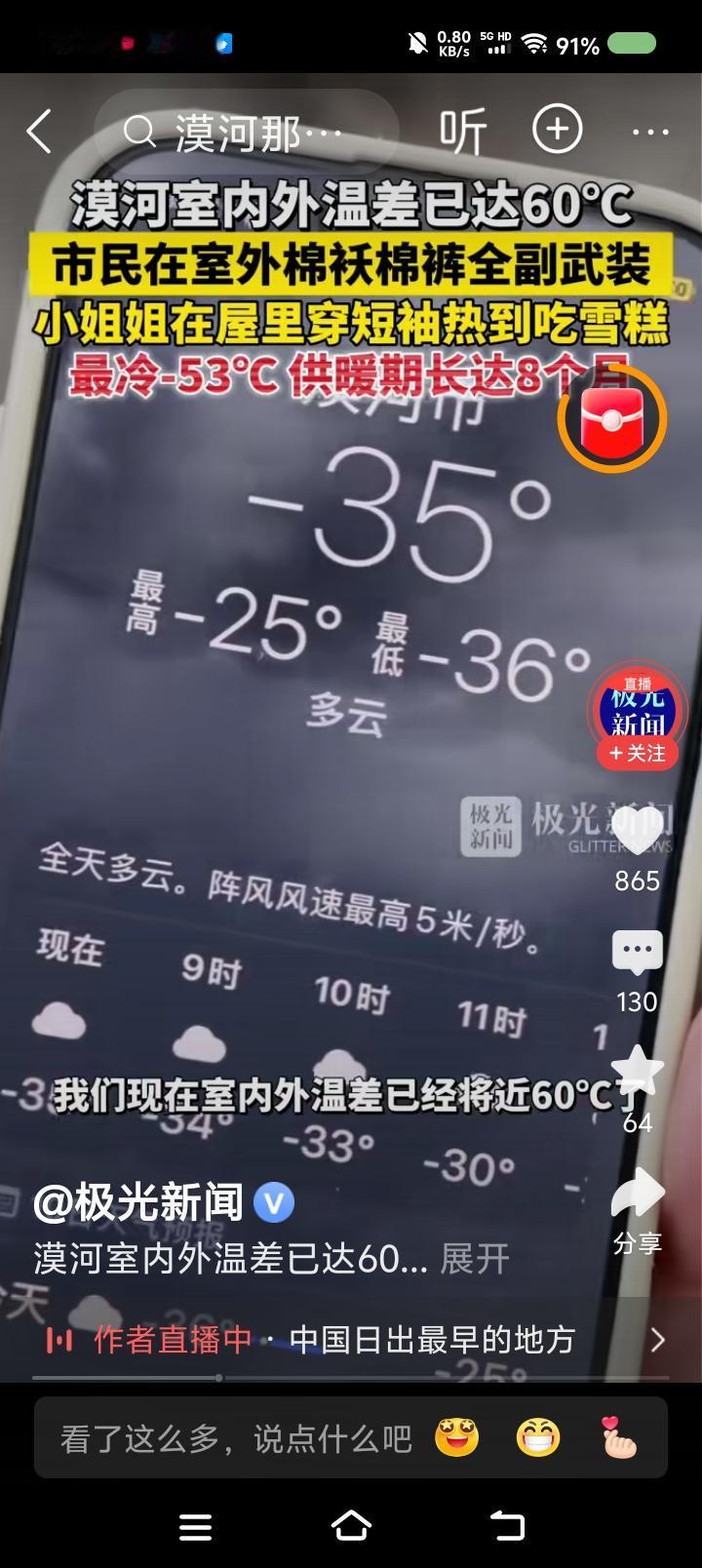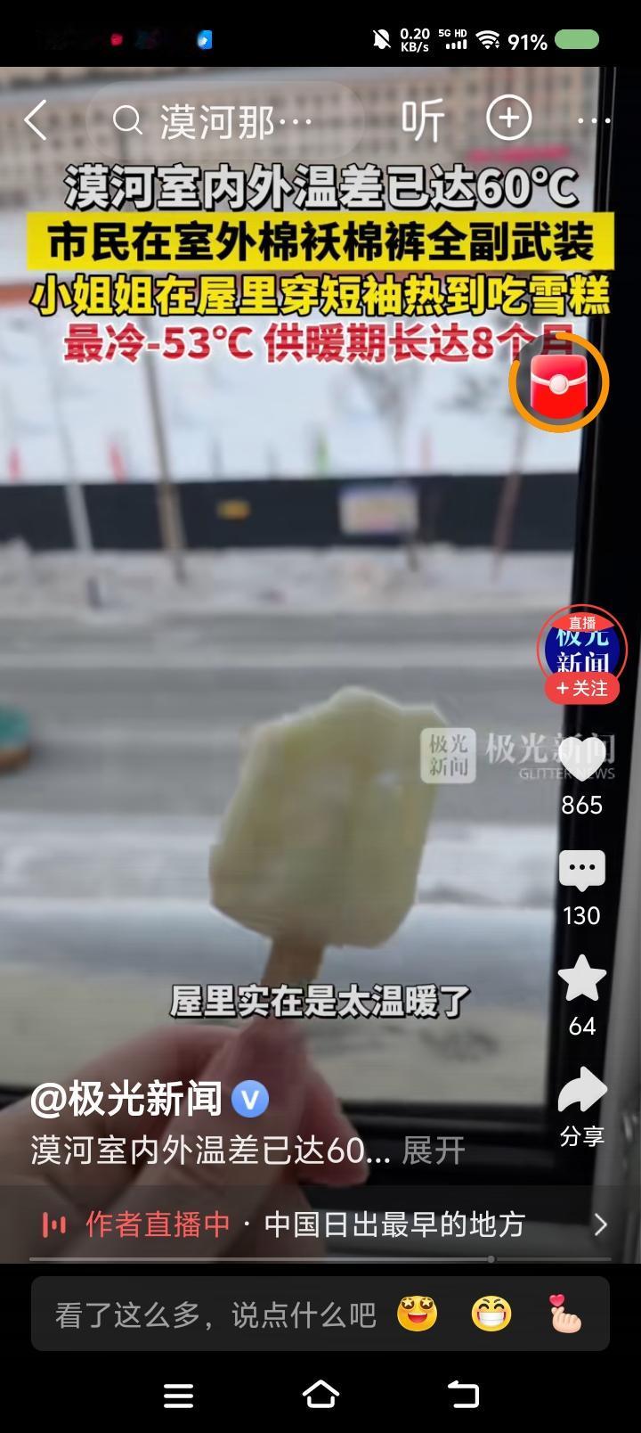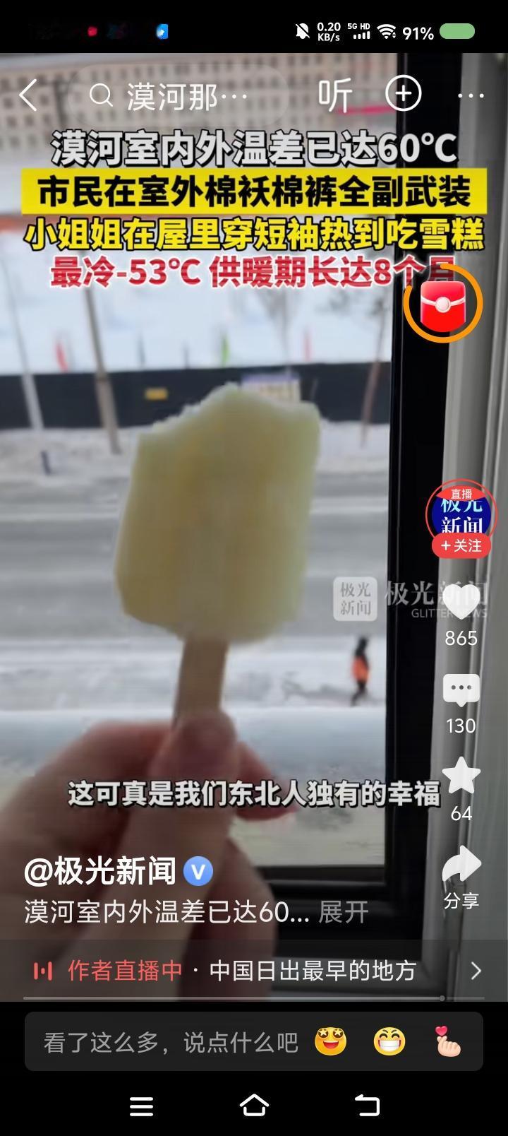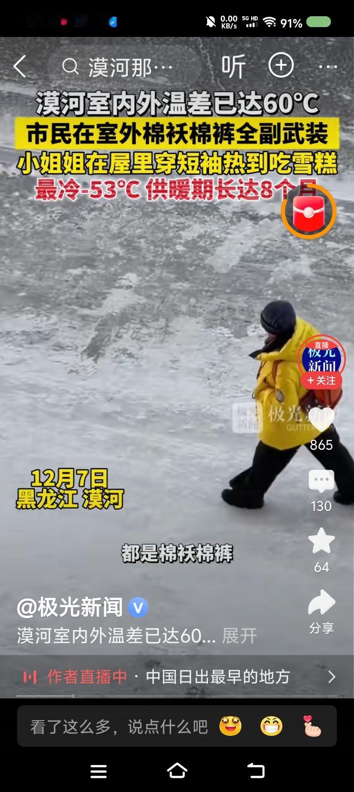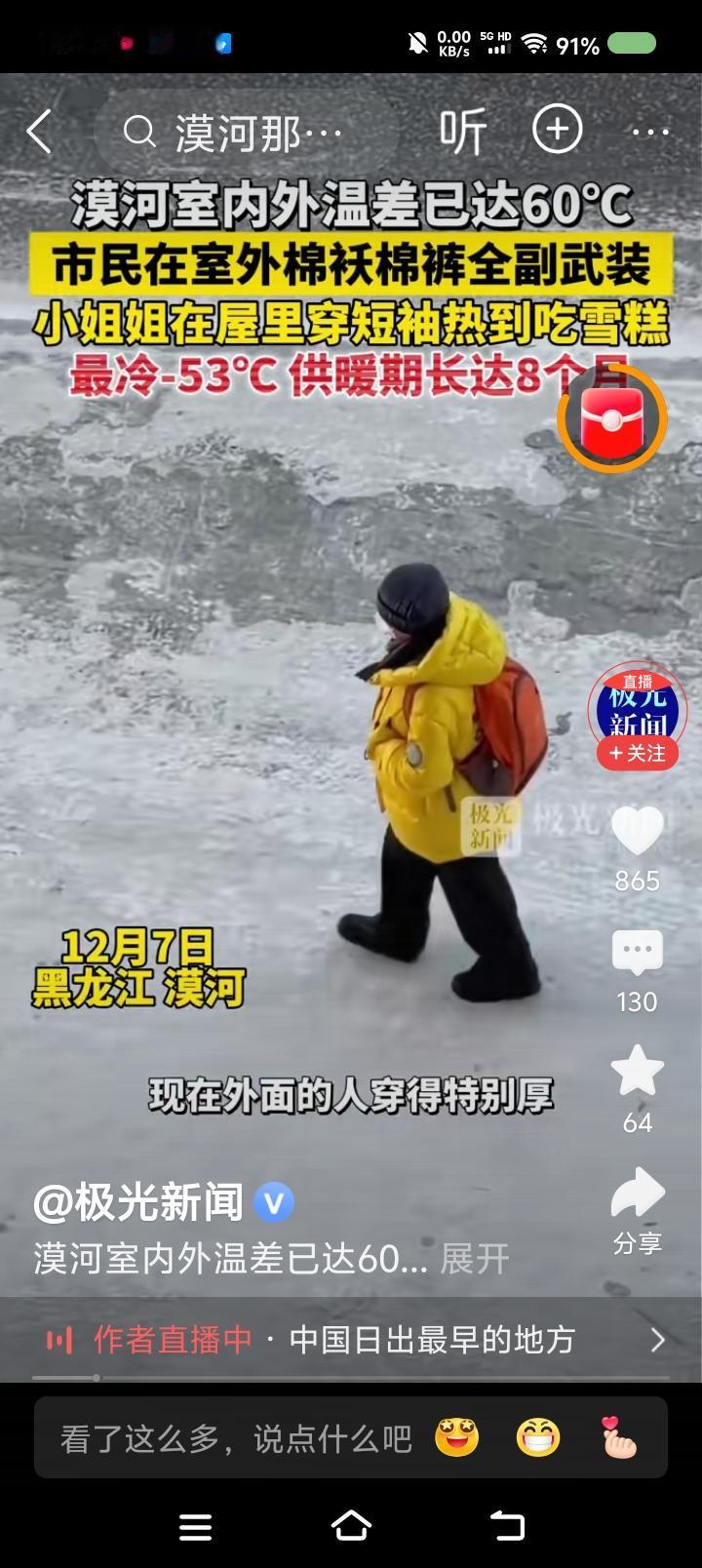 漠河,我去那卖点啥?—— 据报道,近日,漠河室内外温差达60℃。有人屋内热得穿短袖吃雪糕。此地供暖期8个月。 点评: 庄稼怎么长? 我想背一袋米过去,能赚三成么?