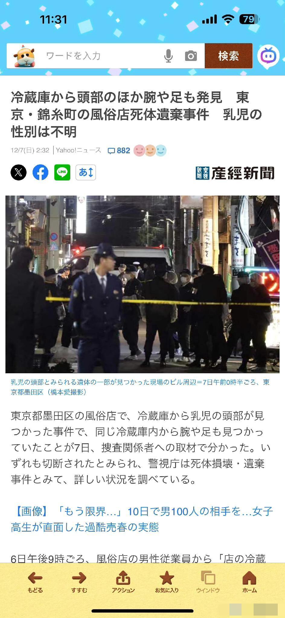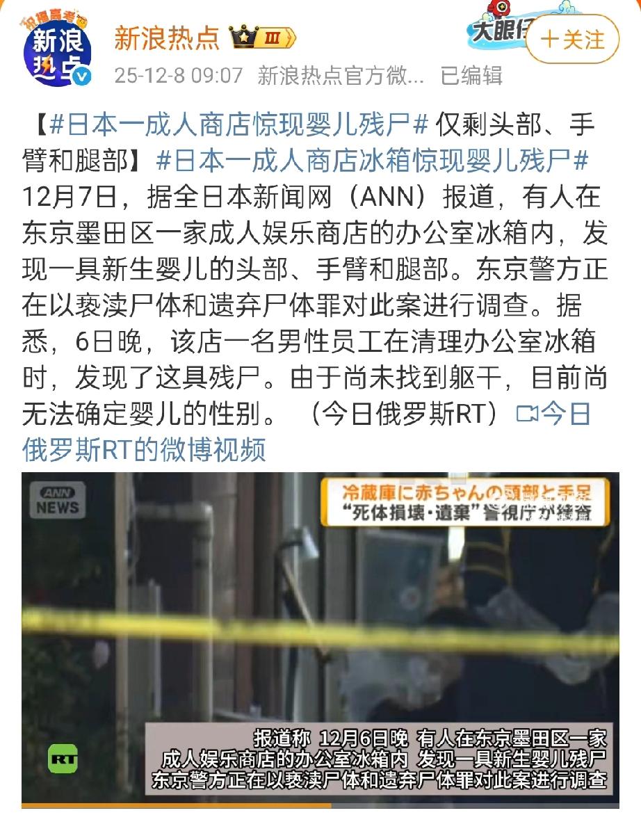 日本一成人商店惊现婴儿残尸 12月6日晚一男性保洁在清扫东京墨田区一风俗店的冰箱时发现了被塑料袋包裹的婴儿脑袋,保洁员随后报警。 警方搜查后还发现了被装进保鲜盒的婴儿四肢,身体没有找到…… 警方正在按尸体遗弃罪进行搜查 海外新鲜事 海外条友说 婴儿尸体