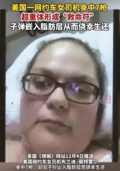 “看来胖也是有好处的!”美国一网约车女司机身中7枪,路人都以为她没救了,结果,送医后检查,女司机超重的体形,成了“救命符”,子弹嵌入脂肪层从而侥幸生还,网友:论肥胖的重要性! 这事听着就跟电影情节似的。女司机当时正在路边等乘客,突然冲出来个歹徒,二话不说就连开7枪,子弹“嗖嗖”打在身上,血一下子就渗了出来。周围人吓得魂都没了,谁都觉得中了这么多枪,肯定没救了,连打急救电话的人声音都在抖。 结果送到医院一检查,医生都愣了——7颗子弹看着吓人,却没一颗伤到要害,全卡在了厚厚的脂肪里。就像打在棉花上,力道被卸了大半,除了皮肉伤和失血,内脏、骨头啥的一点没碰着。医生说,这要是换个体型瘦的人,子弹直接就穿进去了,后果不堪设想。 消息一出来,网友们的评论差点把屏幕掀了。有人开玩笑:“这下减肥的理由又少了一个,脂肪原来是自带防弹衣啊。”有人半认真半调侃:“以前总被说胖,现在看来,这肉长的都是安全感。”也有人理性点:“这纯属巧合,总不能为了防弹故意增肥吧?但确实得说,这次是真靠体型捡回条命。” 说真的,这事儿想想都后怕。7枪啊,换谁身上都得慌,女司机能活下来,运气占了大半,脂肪层成了“缓冲垫”也是事实。但反过来想,这哪是鼓励大家变胖?毕竟平时因为肥胖引发的高血压、糖尿病啥的,可比子弹常见多了。 网友们嘴上喊着“肥胖重要”,心里其实都清楚,这只是个极端个案。就像有人说的:“这就跟下雨天忘带伞,结果发现头顶有片树叶挡了点雨似的,能庆幸,但不能指望树叶当伞用。”女司机自己也说,以后可得好好注意安全,这“好运”可不能指望第二次。 不过这事也确实打破了点刻板印象——平时总被吐槽的“胖”,在极端情况下竟成了“护身符”。生活就是这么奇妙,有些看似不好的东西,说不定在某个角落藏着意想不到的作用。但说到底,健康还是第一位的,真要靠脂肪挡子弹,那代价也太大了。 各位读者你们怎么看?欢迎在评论区讨论。