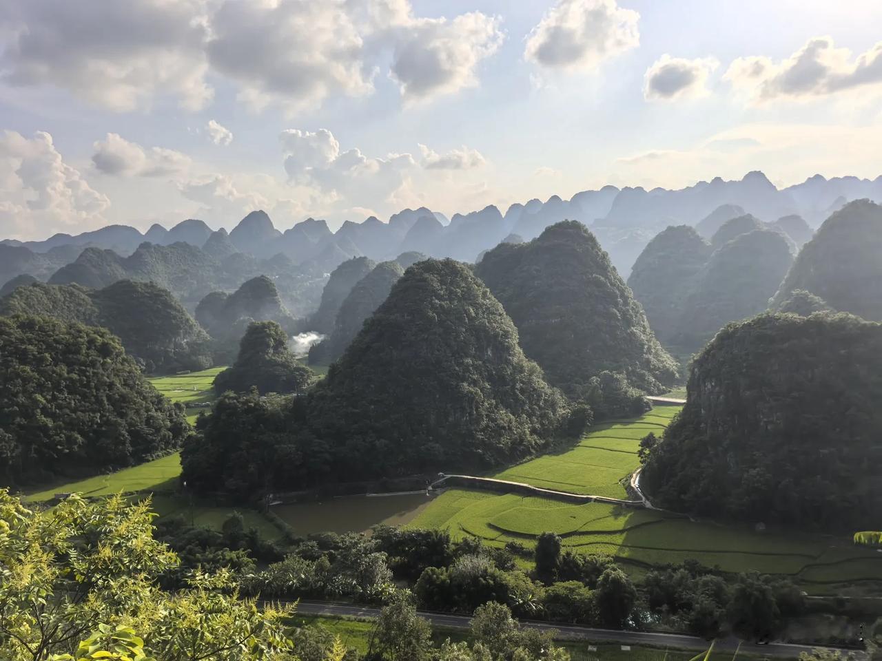 万峰林的奇特之处真的让人惊叹!尤其是纳灰河坡立谷的“八卦田”是大自然的杰作,夕阳下的叠峰连绵起伏,近看的山峰青翠欲滴,远处的则像被轻纱笼罩,夕阳下的光影变化更是美得像电影画面~难怪徐霞客都赞叹:“天下山峰何其多,惟有此处峰成林”呢!