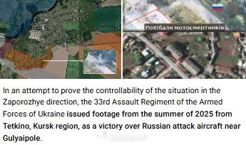 惯犯出击。随着俄军在扎波罗热地区古利亚伊波列不断取得一个又一个的胜利,为保持欧洲和乌克兰国内情绪稳定证明在扎波罗热方向局势可控,乌军第33突击团受命发布了 2025 年夏天在库尔斯克地区泰特基诺拍摄的视频片段,谎称这是在古利亚伊波列附近击败俄罗斯军队的场景。他们既不避讳”证据“中明显的夏季景观,也不避讳那些极易辨认出当地具体定居点的特色建筑。俄乌冲突英国或将80亿英镑俄资产给乌克兰