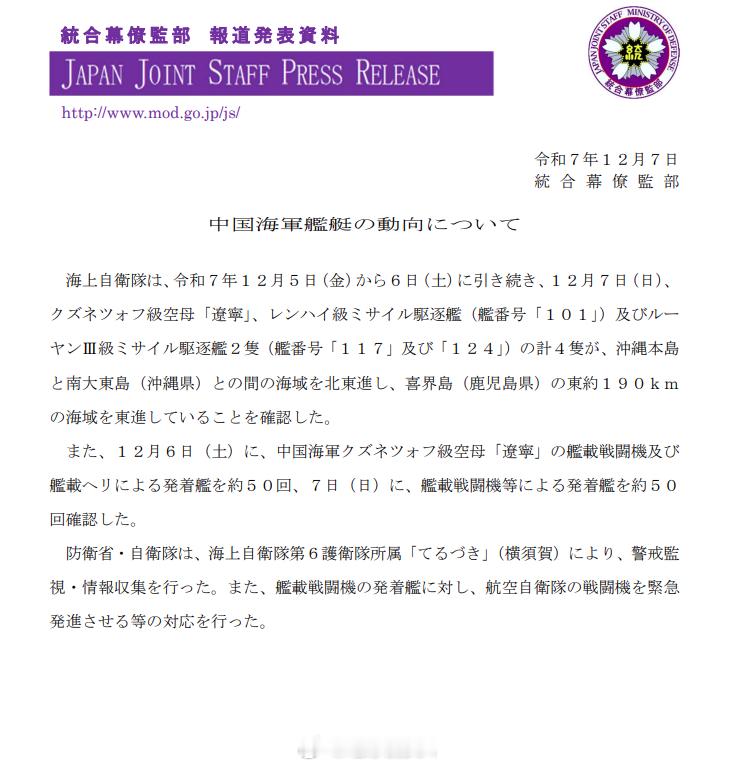 PLA巡视琉球群岛,鬼子内心相当憋屈。2025 年12月7日,中国海军001 型航空母舰辽宁舰(16)、055 型南昌舰(101)、052D 型西宁舰(117)以及开封舰(124)共 4 艘舰艇,在琉球本岛与南大东岛之间向东北方向航行后,又在喜界岛以东约 190 公里海域向东航行。日本与中国竞争已感到绝望中日军机之间发生了什么日本自卫队滋扰辽宁舰训练