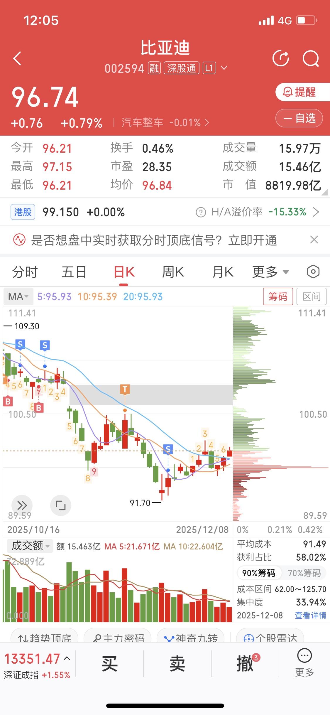 12月的比亚迪上涨0.79点,午盘股价96.74。12月5日临时股东大会上,董事长王传福称比亚迪已是龙头企业,要做好榜样,能被别人欺负,但不能欺负别人,这格局真的大。 在12月8日这天,科技圈也有和比亚迪相关的消息。华为MatePad Mini小平板应用市场上架了一批汽车类应用,其中就有比亚迪。比亚迪作为汽车行业的佼佼者,和华为这样科技巨头的联动,说不定未来会碰撞出更多智能出行的火花,很让人期待后续发展。