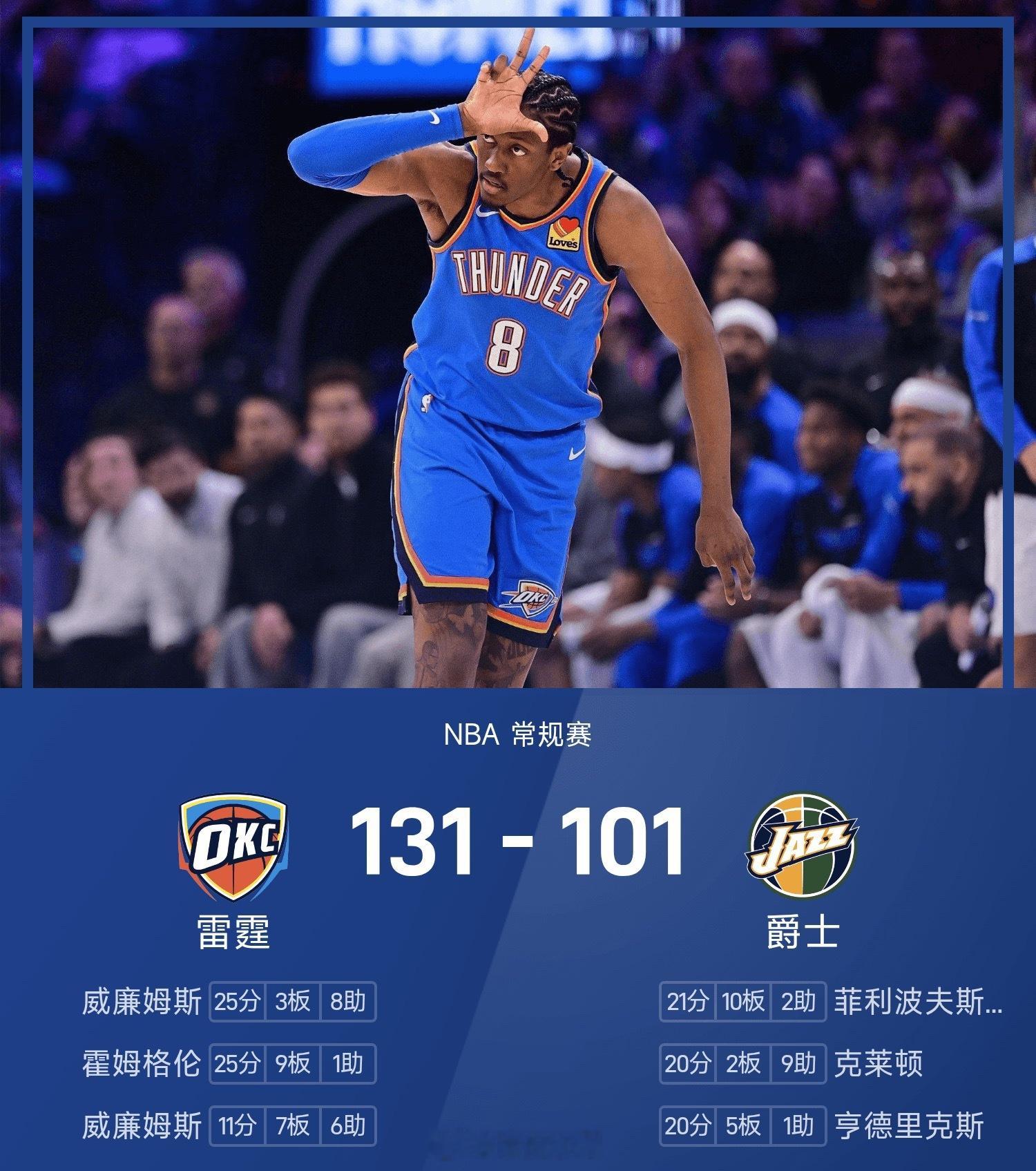 25/26赛季NBA 常规赛,爵士对阵雷霆。双方全场战罢,爵士101-131不敌雷霆。杰伦·威廉姆斯砍下全场最高的25分3板8助,在缺少亚历山大的情况下率领雷霆成功取胜,球队豪取十五连胜。