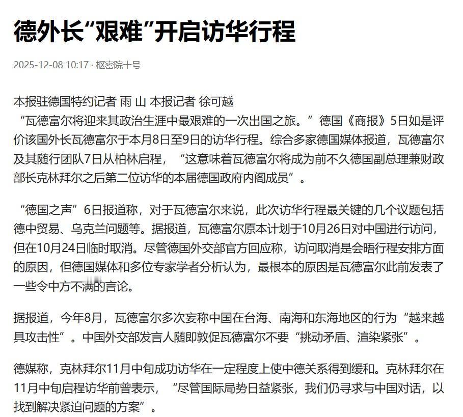 一些西方国家的政治人物既想在世界塑造对中国强硬的形象,又想与中国做生意发展经济甚至想占中国的便宜,还想同时与中国搞好关系,哪里有这样的事情?中国绝对不惯着他们,肯定要坚守自己的国家利益。德国外长之前想访问中国最后改变了行程,很大可能就是这个原因;现在他最终能够成行,主要还是因为他改正的错误让中国能够接受。如果德国外长再不吸取教训,后面可能影响的是更高层次交流。