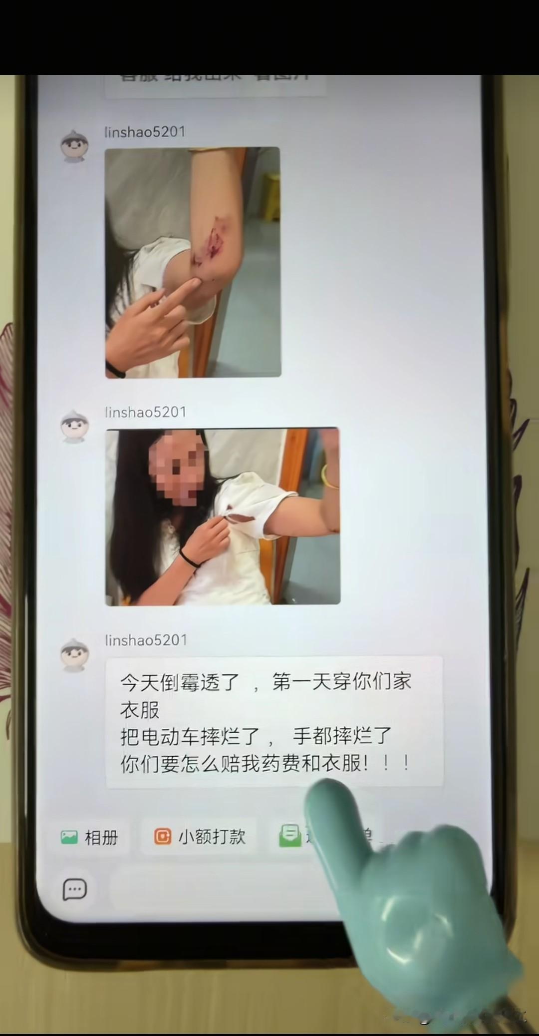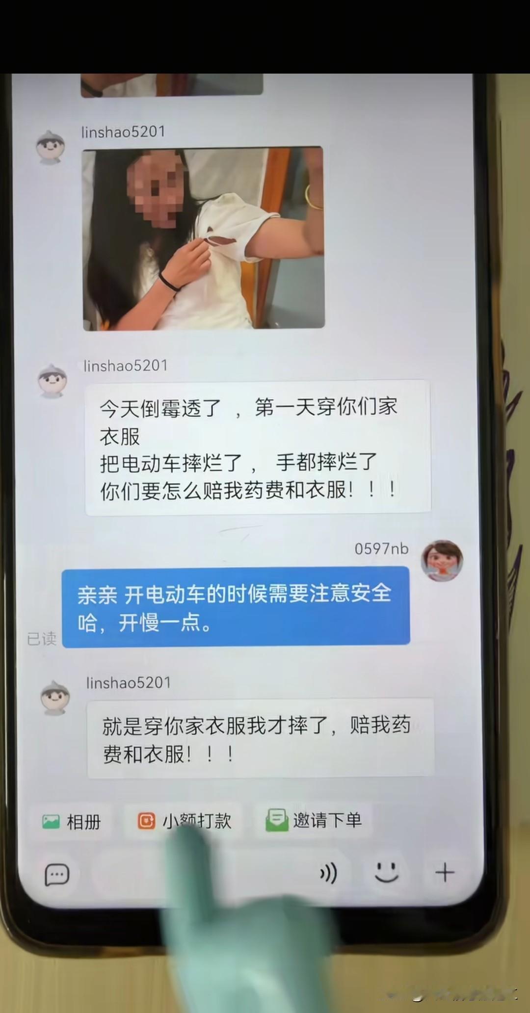 网友,客服出来,今天穿了你家的衣服电动车都摔烂了,人也磕了,衣服也破了,倒霉透了 客服,骑电车注意安全,慢点 网友,就是穿了你家衣服,你要赔偿损失……
