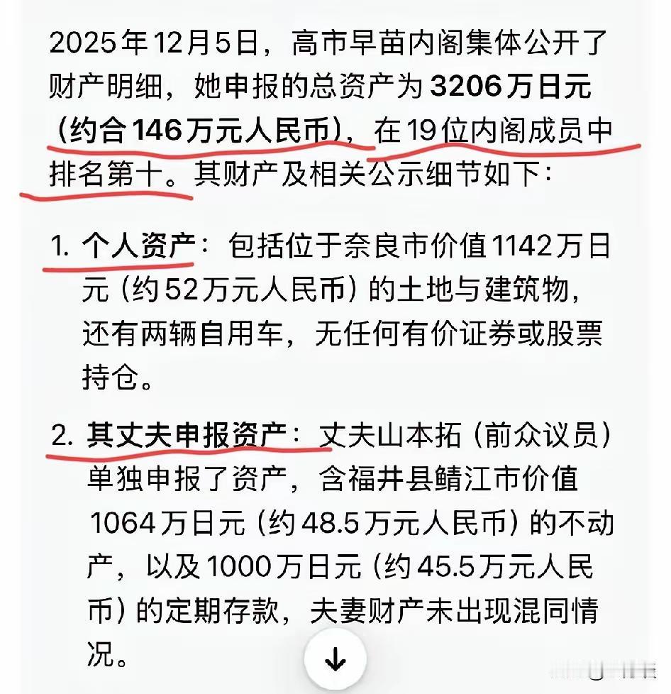 一个日本首相仅有146万元的财产,一定是骗人的。 日本高市早苗政府在民众,在野党,媒体的监督下终于公布了各位官员的财产,这也是日本继台湾民进党公务员在强大压力下公布财产后的跟进。 高市早苗公布了本人及丈夫共有的财产,约合人民币146万。高市早苗从政30多年了,平时吃饭,接待宴请,服装,旅游等都是公款报销,到现在一家人的财产才146万,绝对是骗人的。必须深挖,继续批斗,好自为之,立即改正,悬崖勒马。